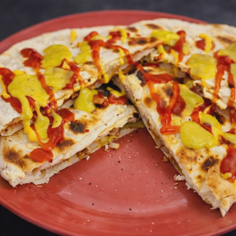 tortilla de harina asada complementada con quesillo gratinado, queso amarillo, jamón y cebolla caramelizada.