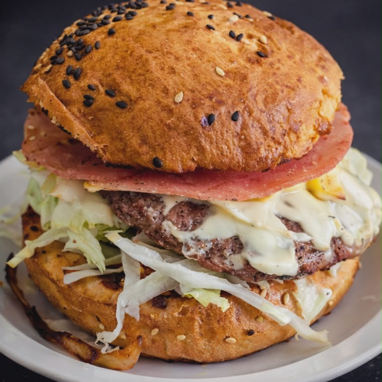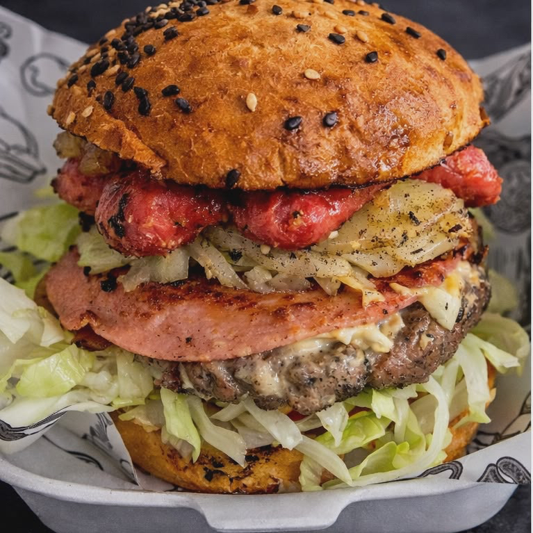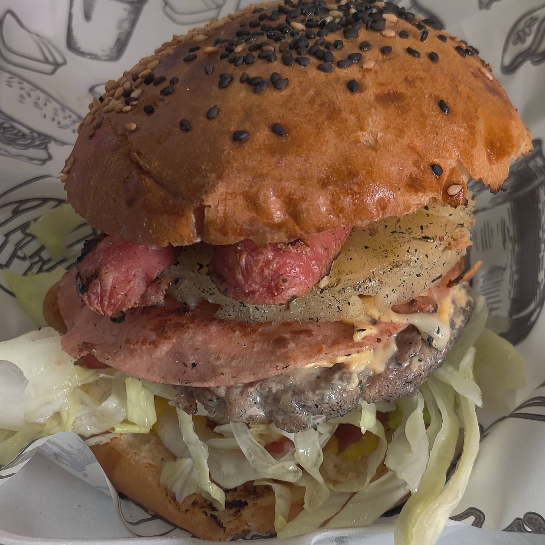 Deliciosa hamburguesa elaborada con pan Brioche, piña asada, salchicha asada, tocino crujiente y vegetales frescos.