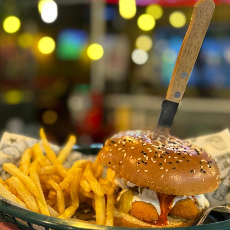Carne de res 160 gr, 3 Aros de Cebolla, Queso Americano con salsa ahumada y 130 gr de papas francesas.