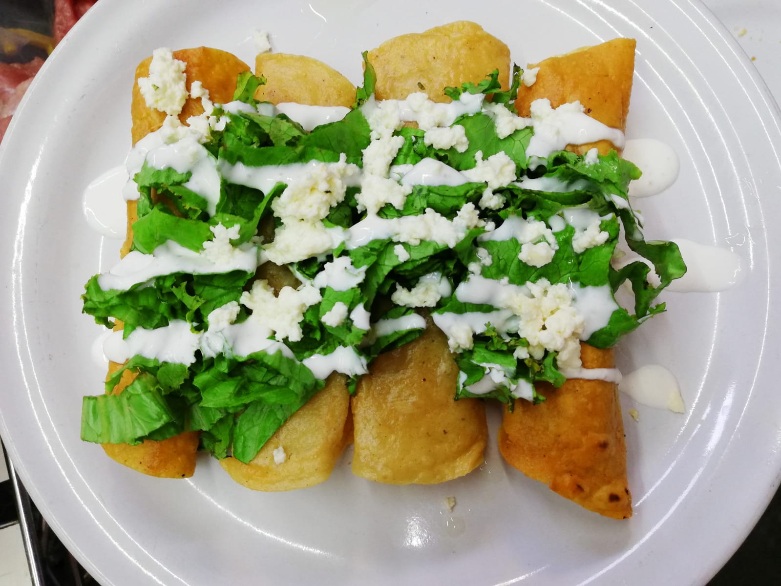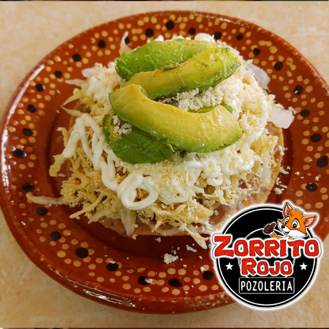 Tostada crujiente, frijoles, queso, crema y aguacate.