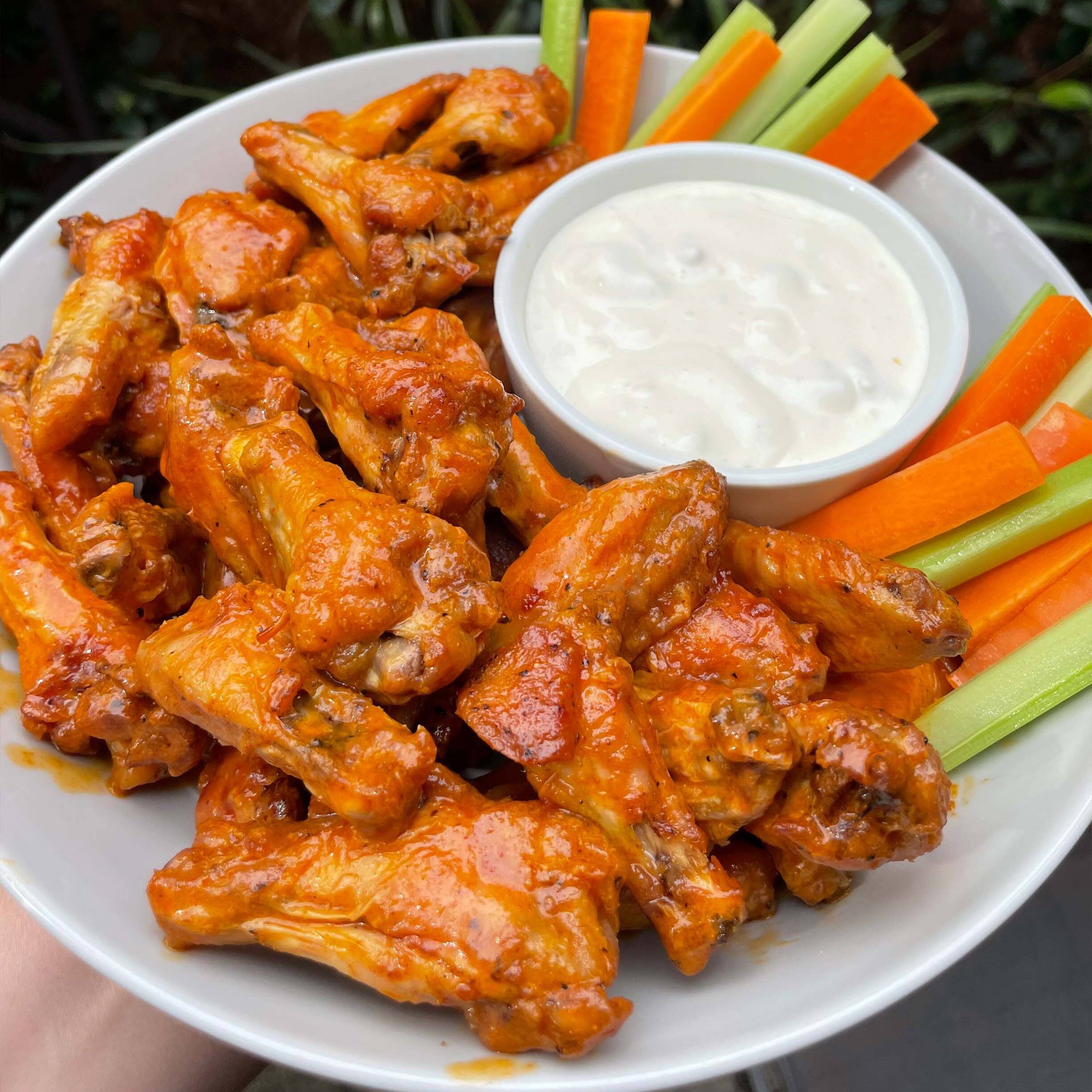Ricas alitas con salsa de su preferencia y verdura a seleccionar