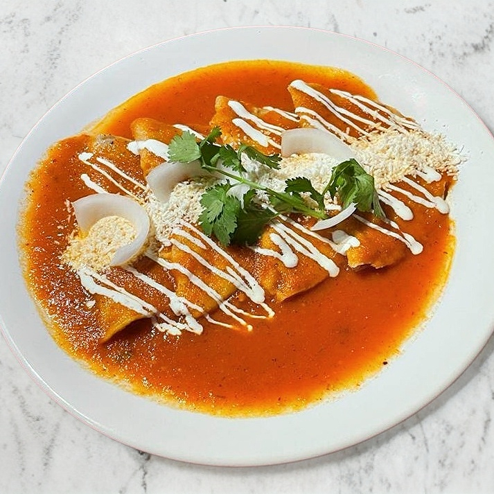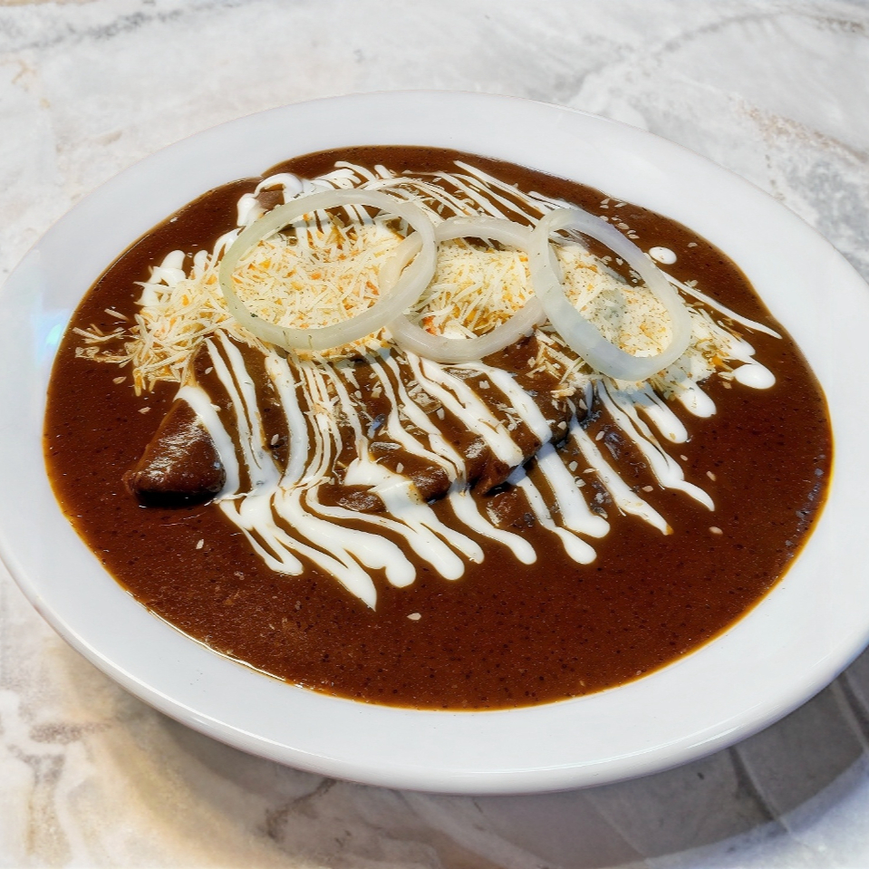 Tres tortillas de maíz rellenas de pechuga de pollo, bañadas con el mole especial de la casa. Se sirven con crema, queso cotija, cebolla y ajonjolí.