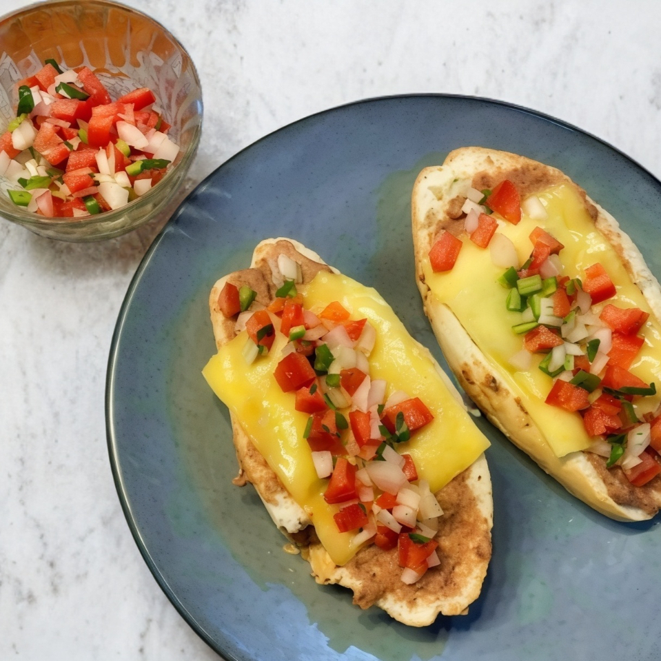 Clásicos molletes servidos con queso manchego, frijoles y salsa mexicana.