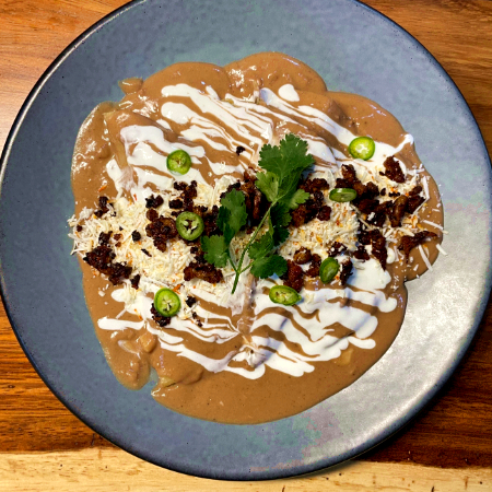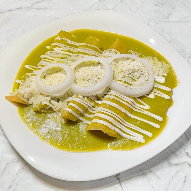 3 piezas de tortilla de maíz rellenas de pechuga de pollo, bañadas con crema de frijol. Se sirven con crema, queso cotija, cebolla, cilantro, chile serrano y chorizo.