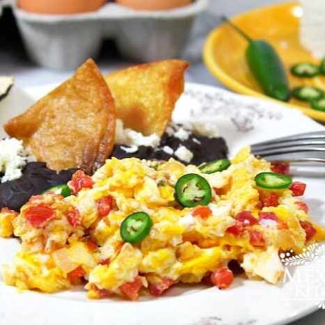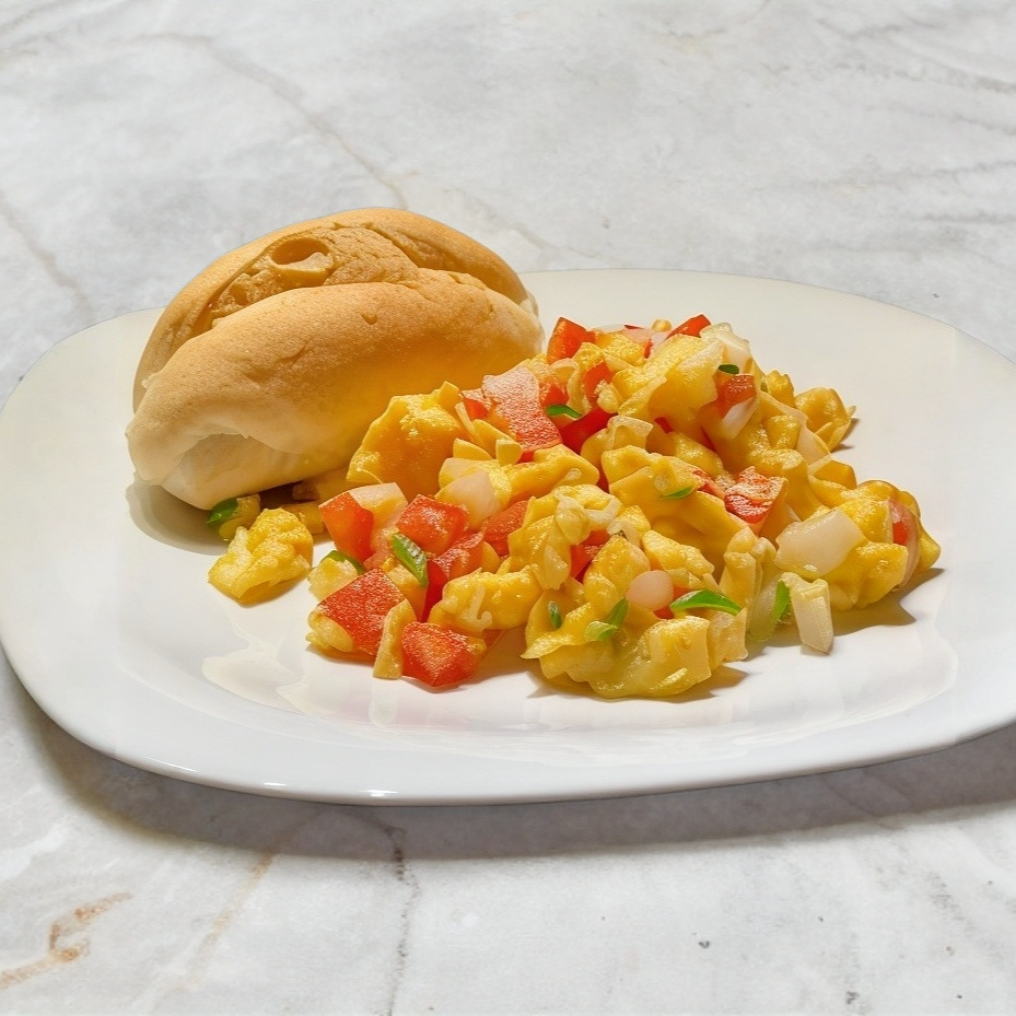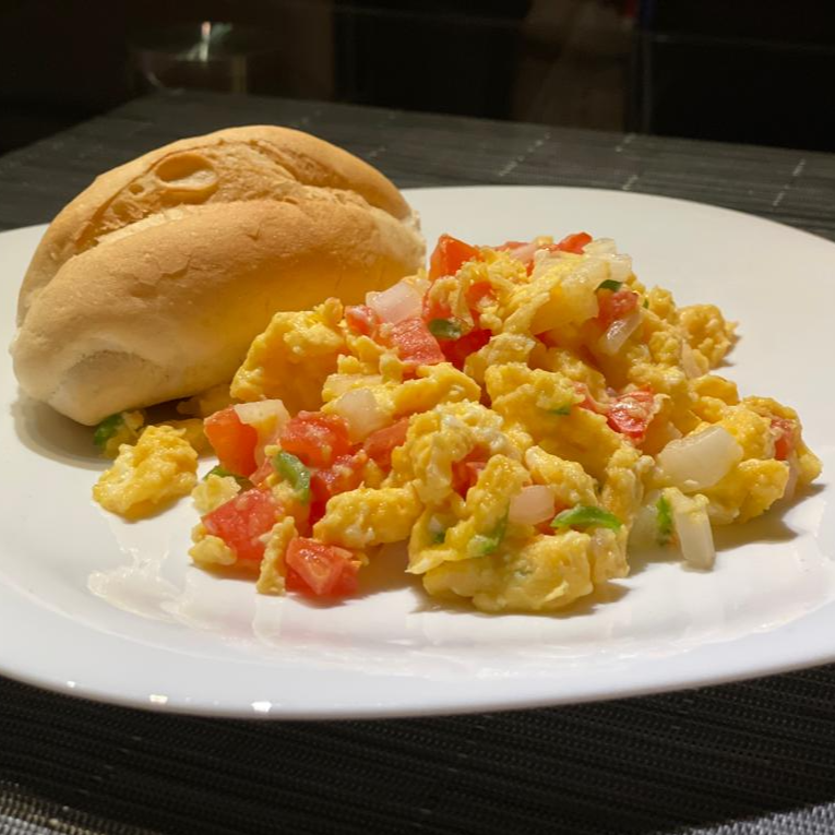 Disfruta de un desayuno tradicional, 3 piezas de huevo revuelto sofrito con jitomate, cebolla y chile serrano, lo acompañamos con un mini cuernito de mantequilla