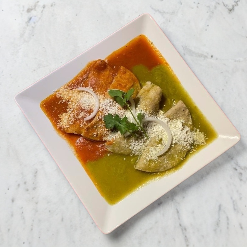 3 piezas de enchiladas rellenas de pechuga de pollo, bañadas en salsa verde por un lado y por el otro con salsa roja, se sirven con crema, queso cotija, cebolla y cilanto