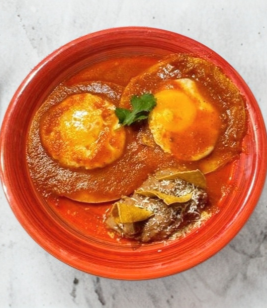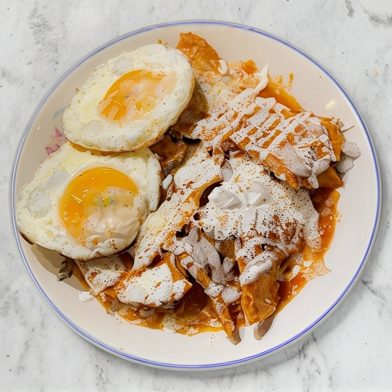 Desayuno clásico mexicano, dos huevos estrellados servidos en una cama de tortilla sofritas, y bañados con nuestras dos salsas roja y verde, se acompañan con un mini cuernito de mantequilla