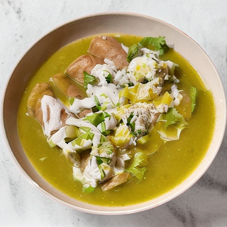 3 piezas de enchilas rellenas de pollo, bañadas en salsa verde casera, se sirven con queso cotija, crema, cebolla y cilantro