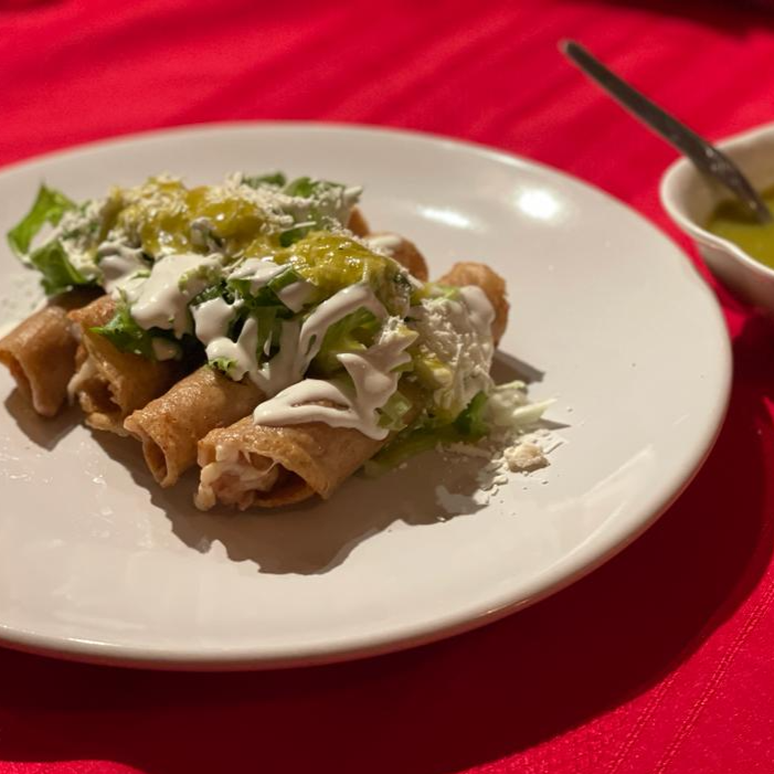 3 Tacos dorados rellenos de pollo, se sirven con Lechuga, queso cotija, crema y salsa de tu elección