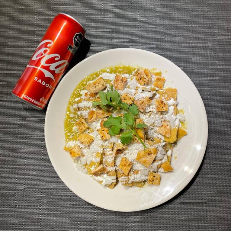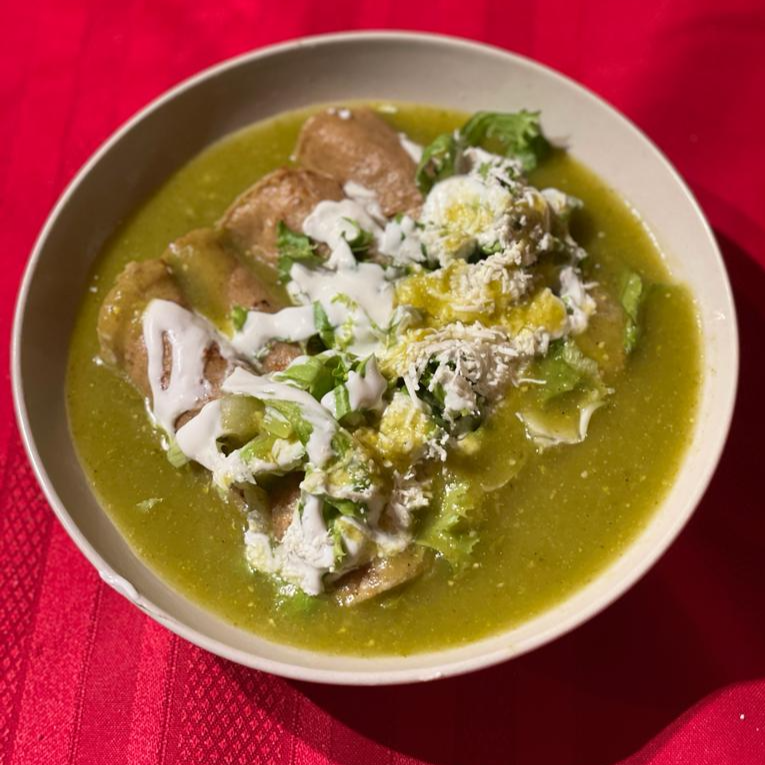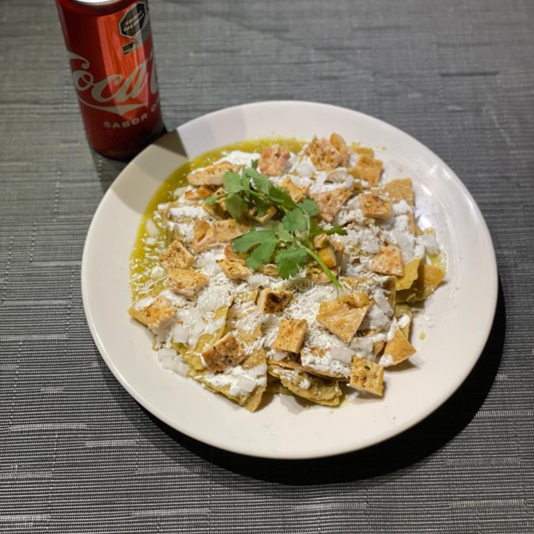 Crujientes totopos de maíz bañados con una salsa verde casera, acompañados con crema, queso Cotija, cilantro y cebolla. Con proteína de tu elección.