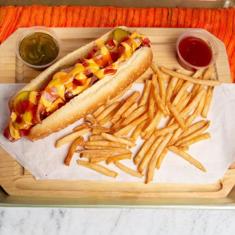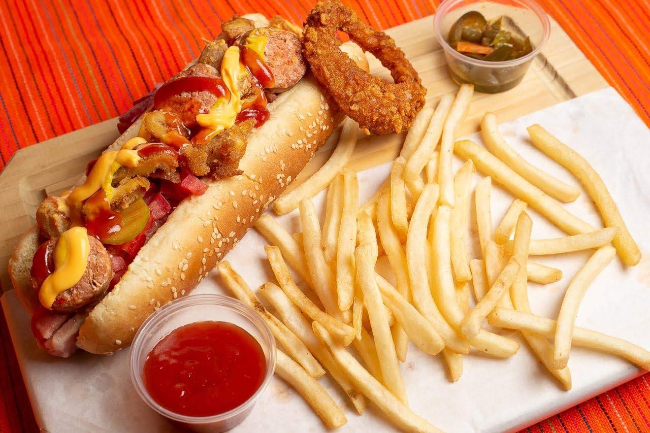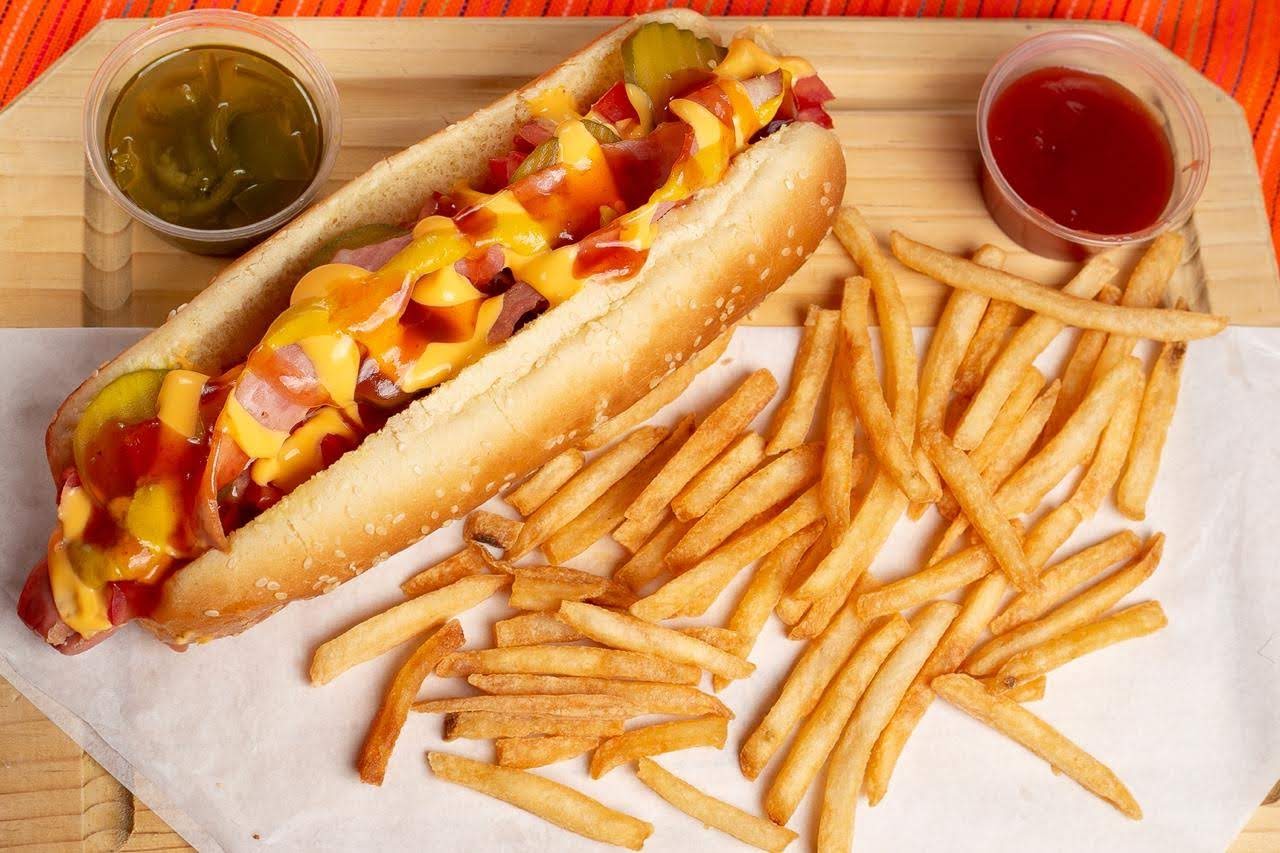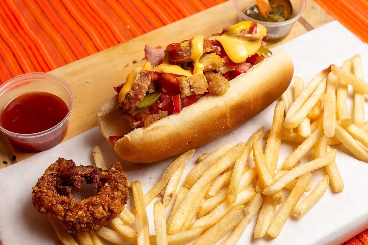 Pan especial, salchicha de pavo, jitomate, pepino, aderezos, queso derretido, tocino, aros de cebolla y papas.