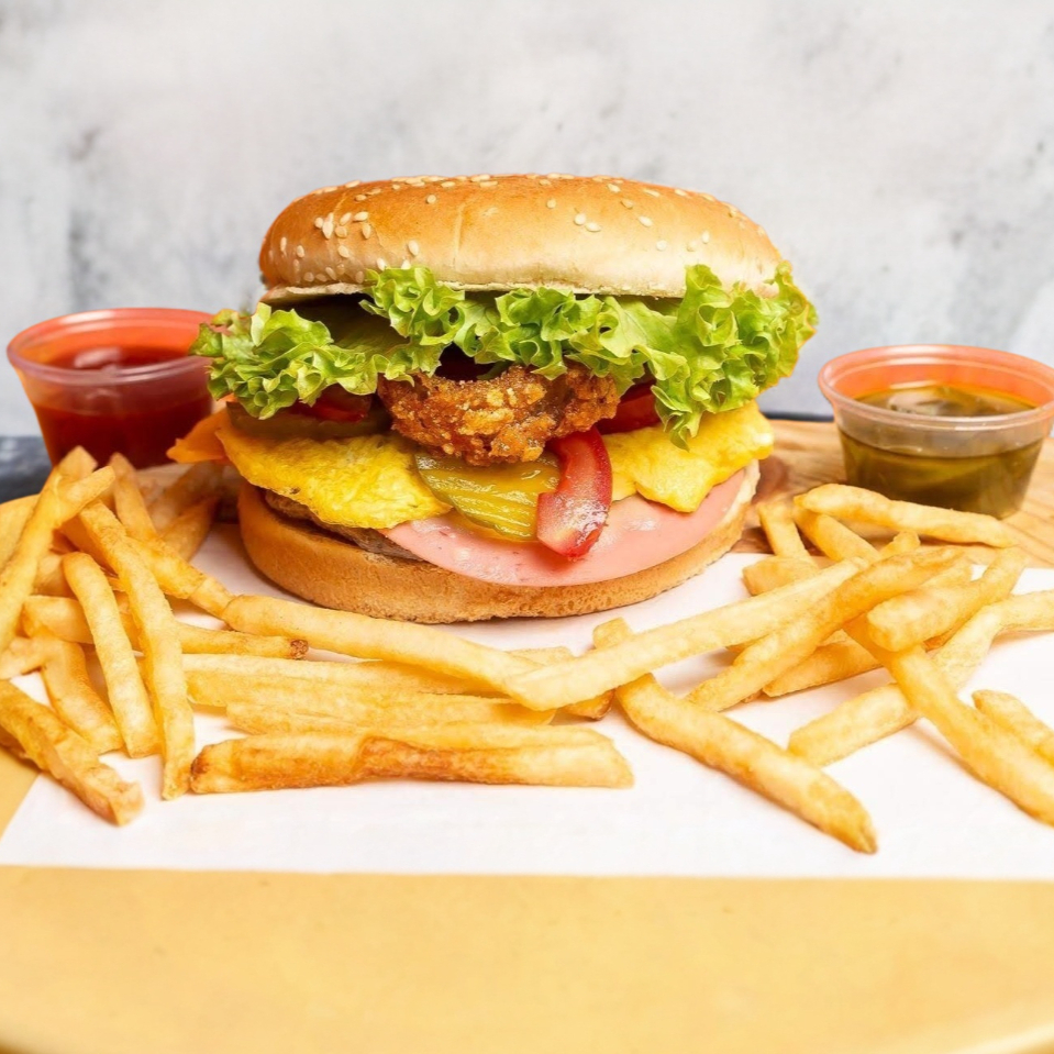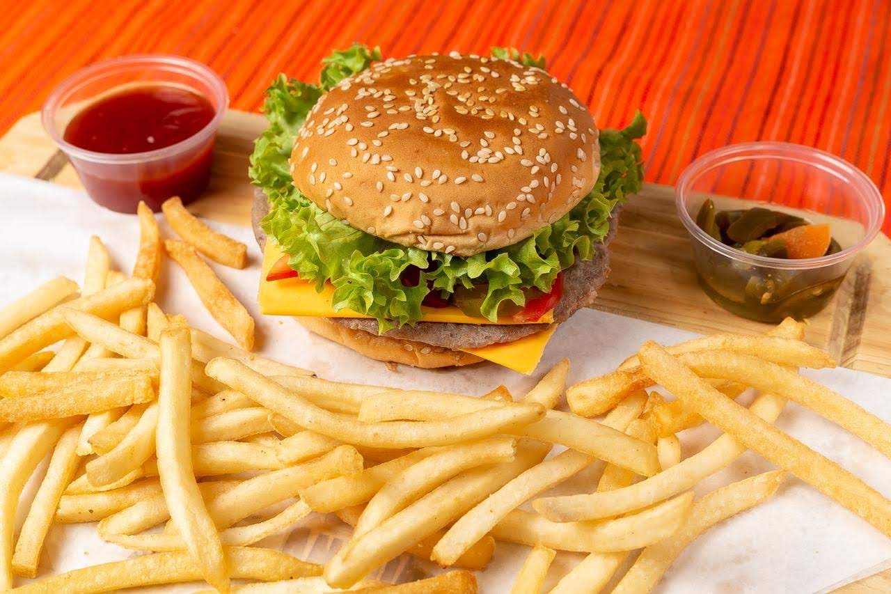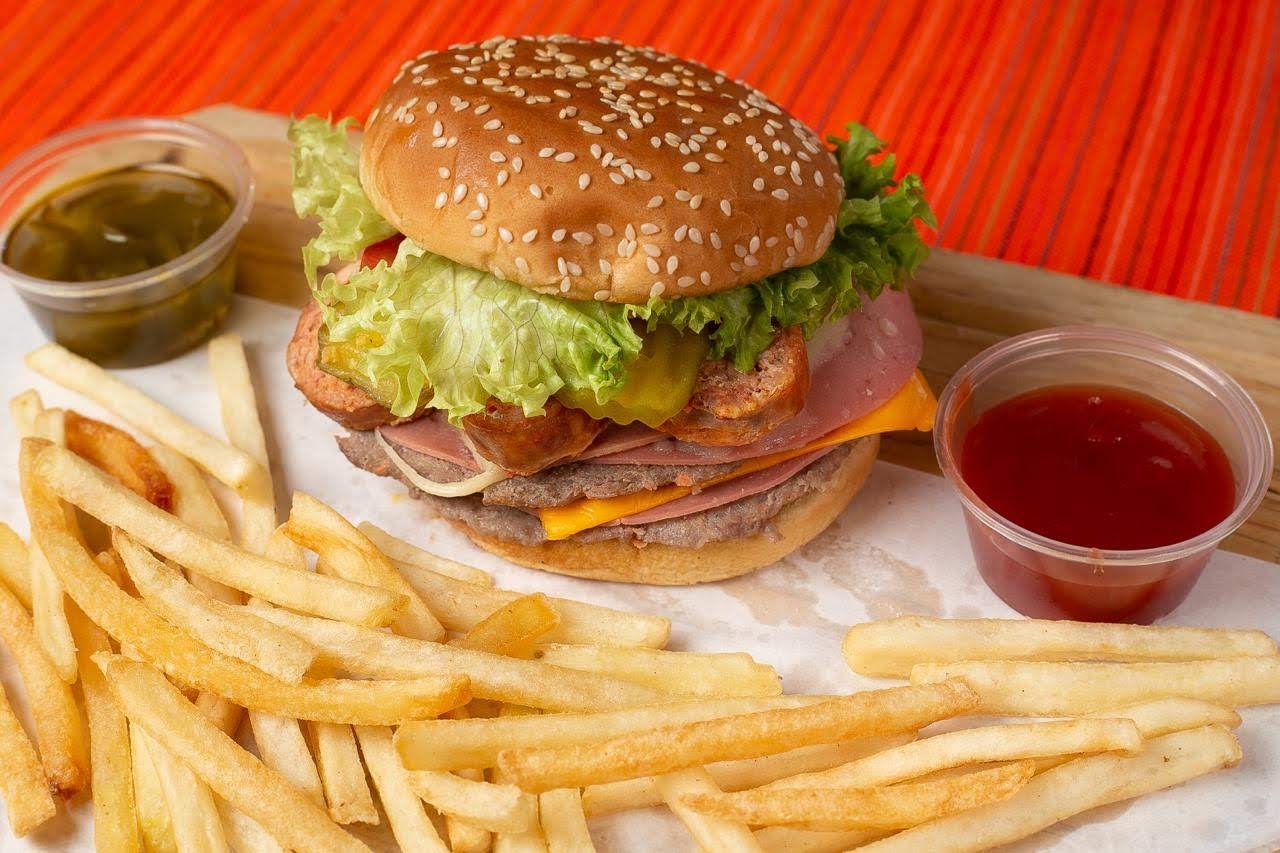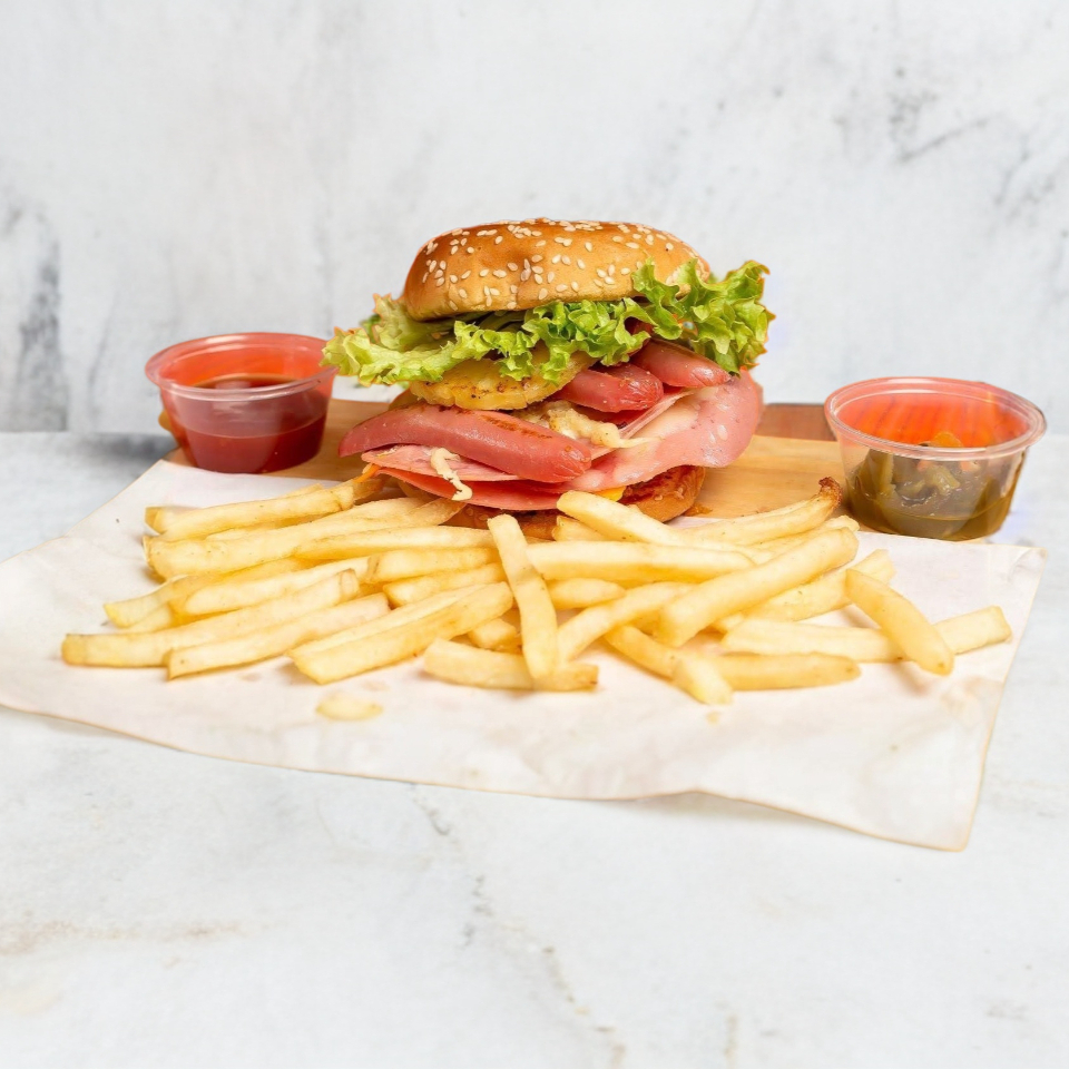 Pan, carne especial de res, queso cheddar, lechuga hidropónica, jitomate, pepino, jamón de pavo y papas.