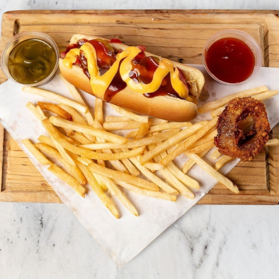 Pan especial, salchicha de pavo, jitomate, pepino, aderezos, costra de queso, aros de cebolla, salsa BBQ y papas.