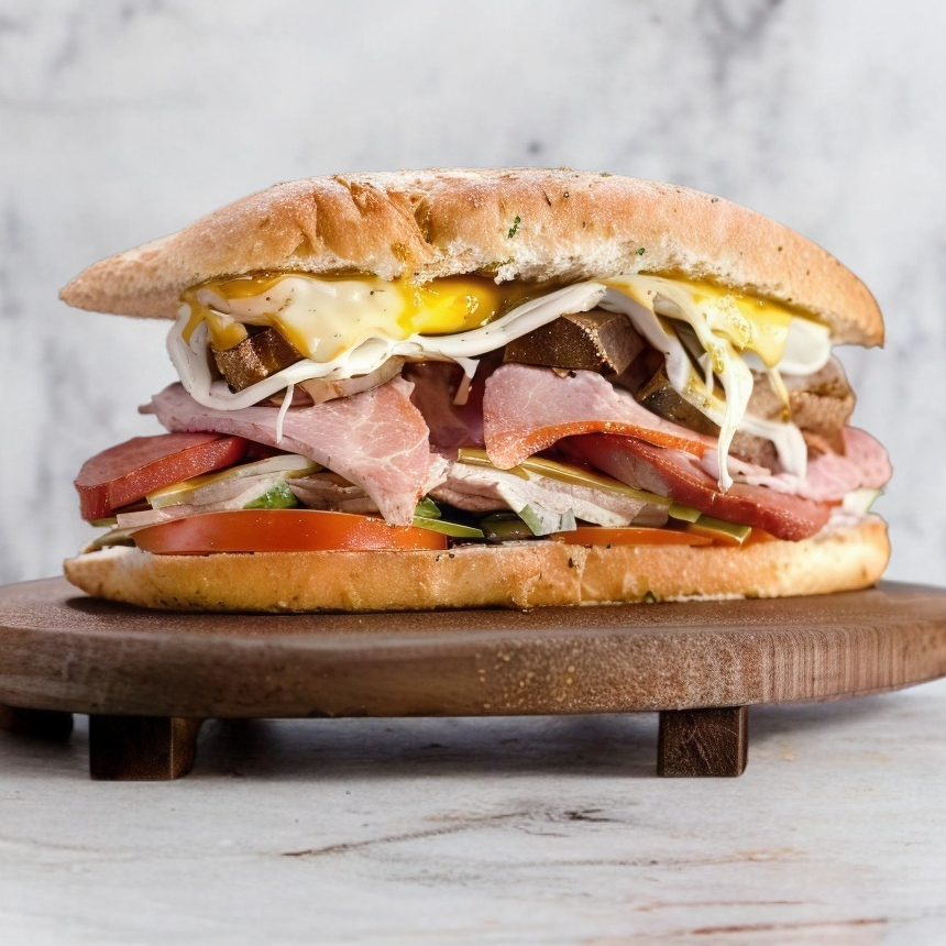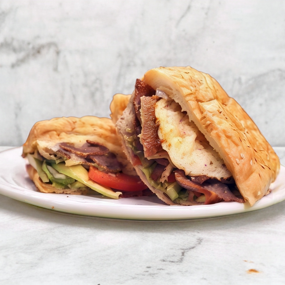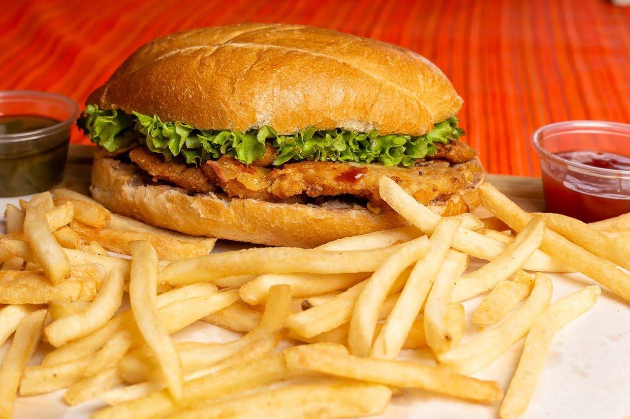 Pan, carne de pollo empanizada, mezcla gourmet de quesos, lechuga hidroponica , jitomate, pepino, jamón de pavo, salchicha de pavo, piña y papas.