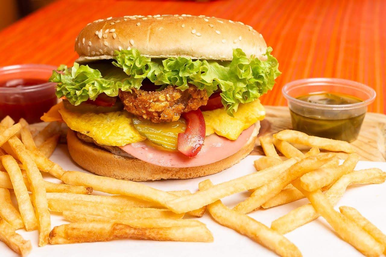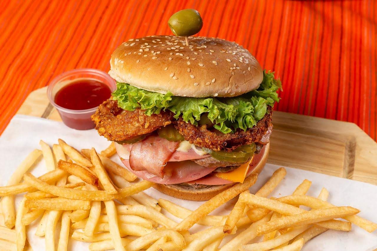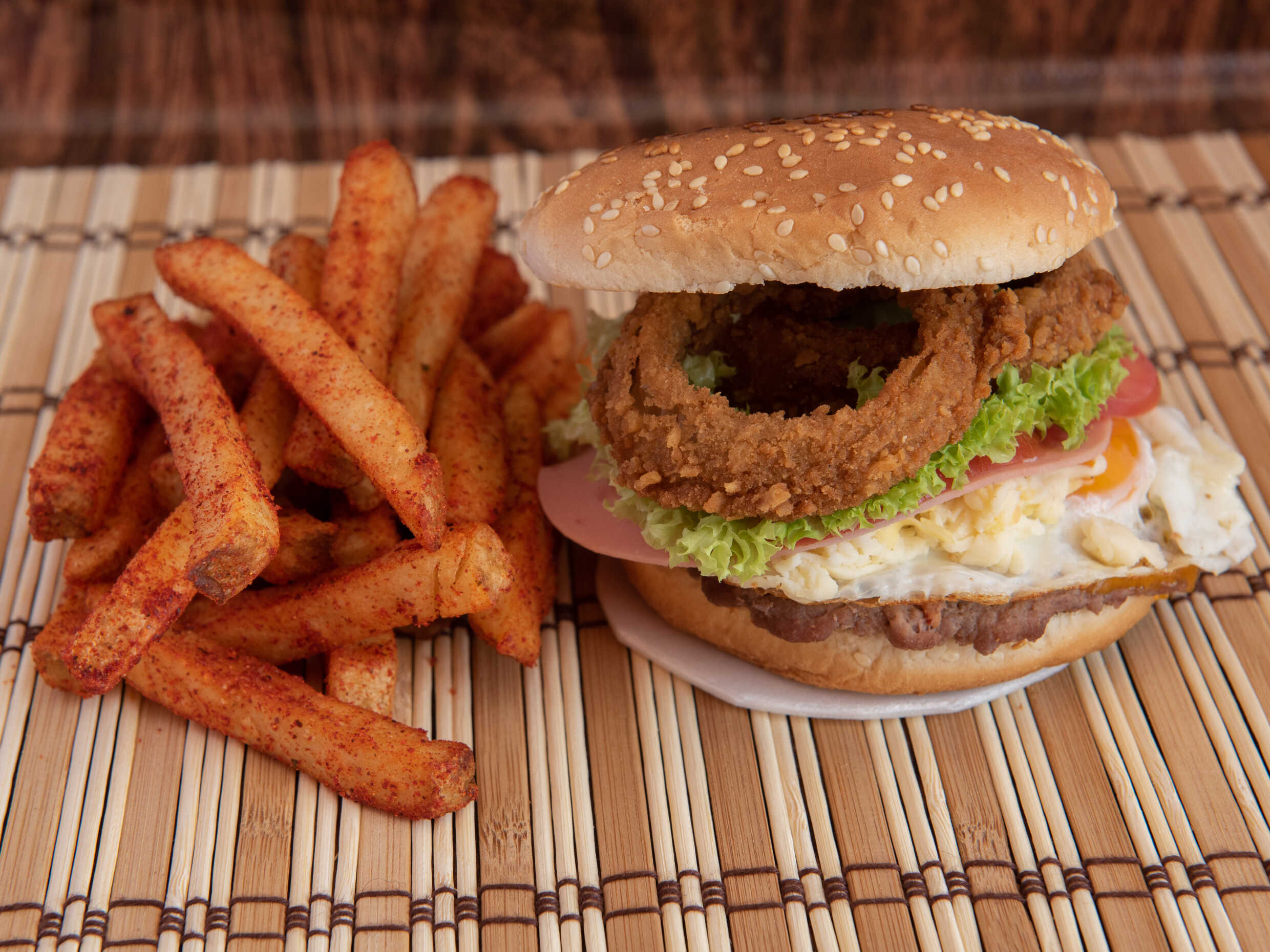 Pan, carne especial de res, mezcla gourmet de quesos, lechuga hidropónica, huevo, aros de cebolla, jamón de pavo, aderezos y papas.