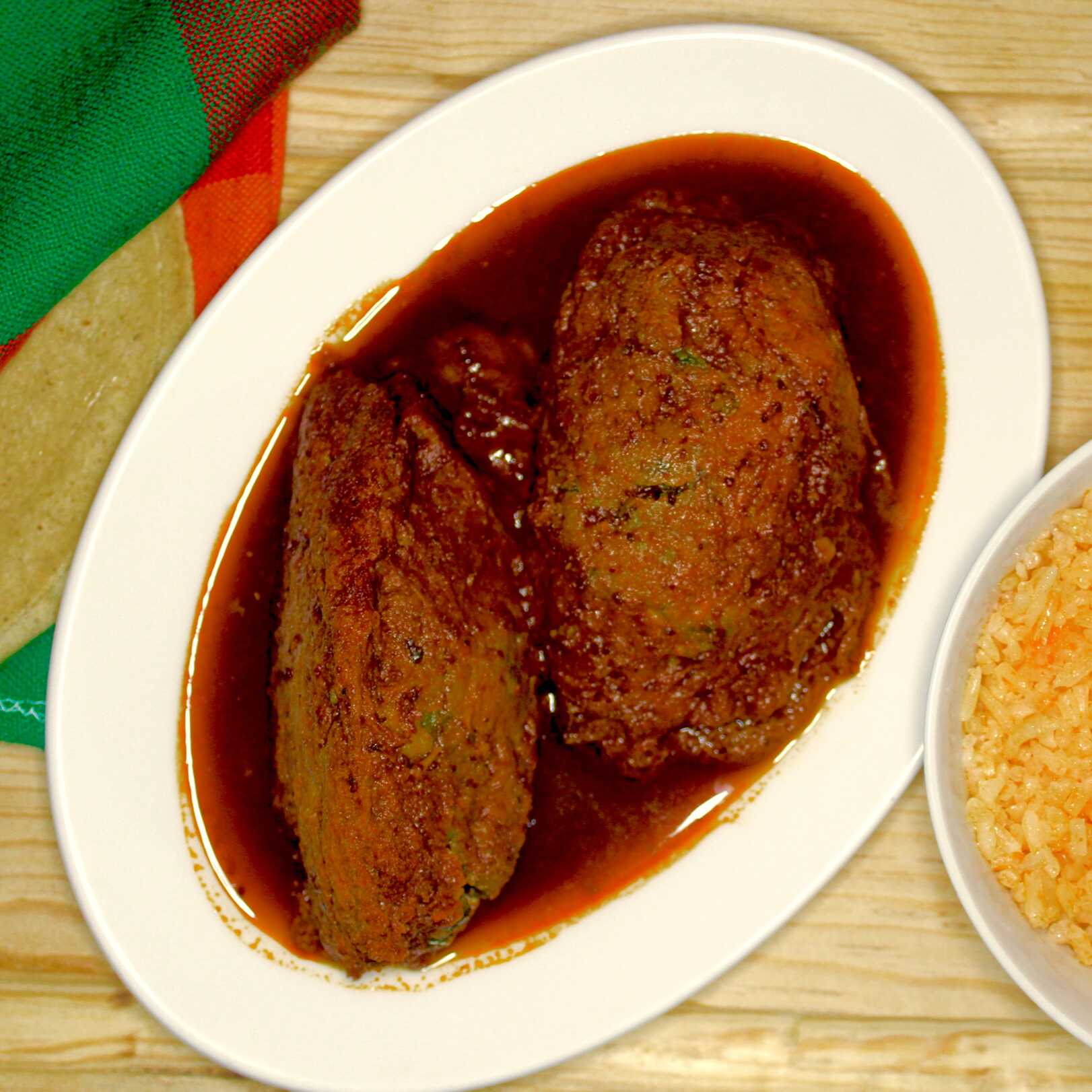 Una tortita de huauzontle capeado y rellenas de queso panela en Chile Pasilla, incluye arroz y tres tortillas.