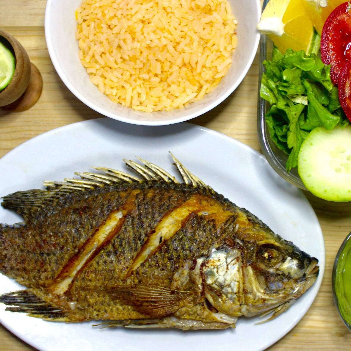 Mojarra frita (500g ) acompañada de arroz y ensalada (lechuga romana e italiana, naranja, pepino, jitomate y limon). incluye 3 tortillas 100% de Maiz.