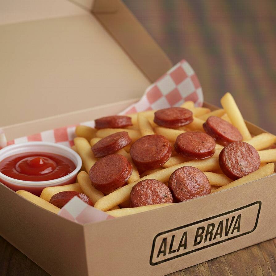 Trocitos de salchicha con papas a la francesa.