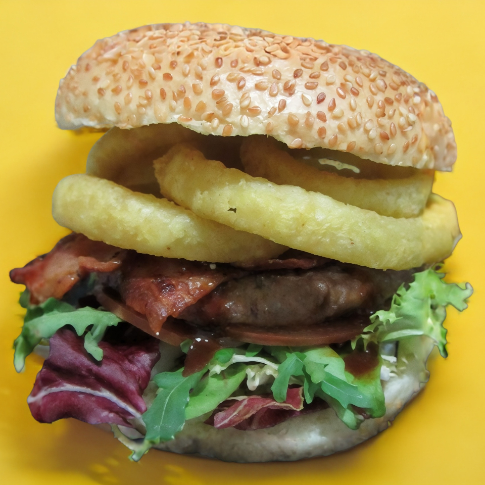 Hamburguesa acompañada de una porción de jugosa carne, aros de cebolla, jitomate, lechuga, chiles en vinagre, queso oaxaca, queso amarillo y aderezos.
