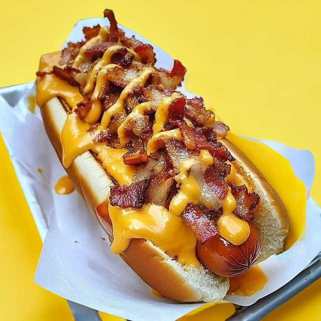 Delicioso Hot dog especial acompañado de jamon, cebolla, jitomate, queso oaxaca, chiles en vinagre y tocino