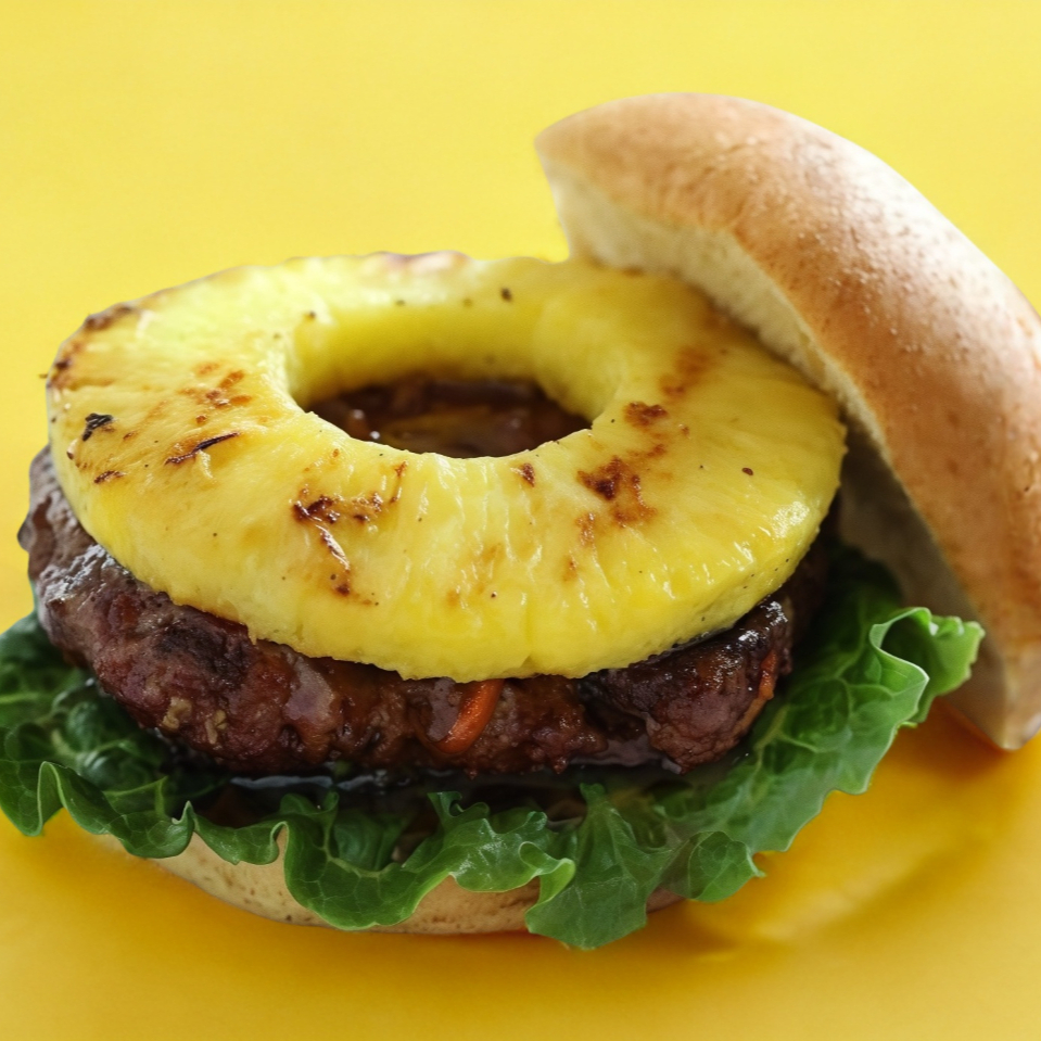 Hamburguesa hawaiana acompañada una porción de jugosa carne, lechuga, jitomate, cebolla, chiles en vinagre, queso oaxaca, queso amarillo, jamón, piña y aderezos.