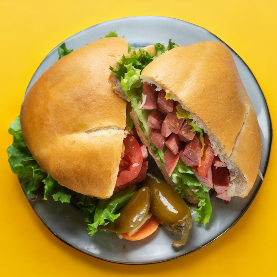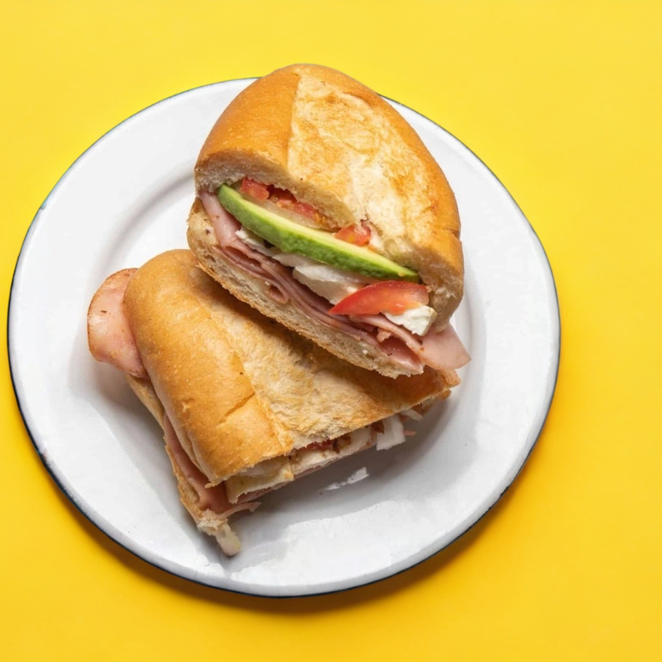 Torta de jamón acompañada de cebolla, jitomate, queso amarillo, queso doble crema, aguacate y chiles en vinagre