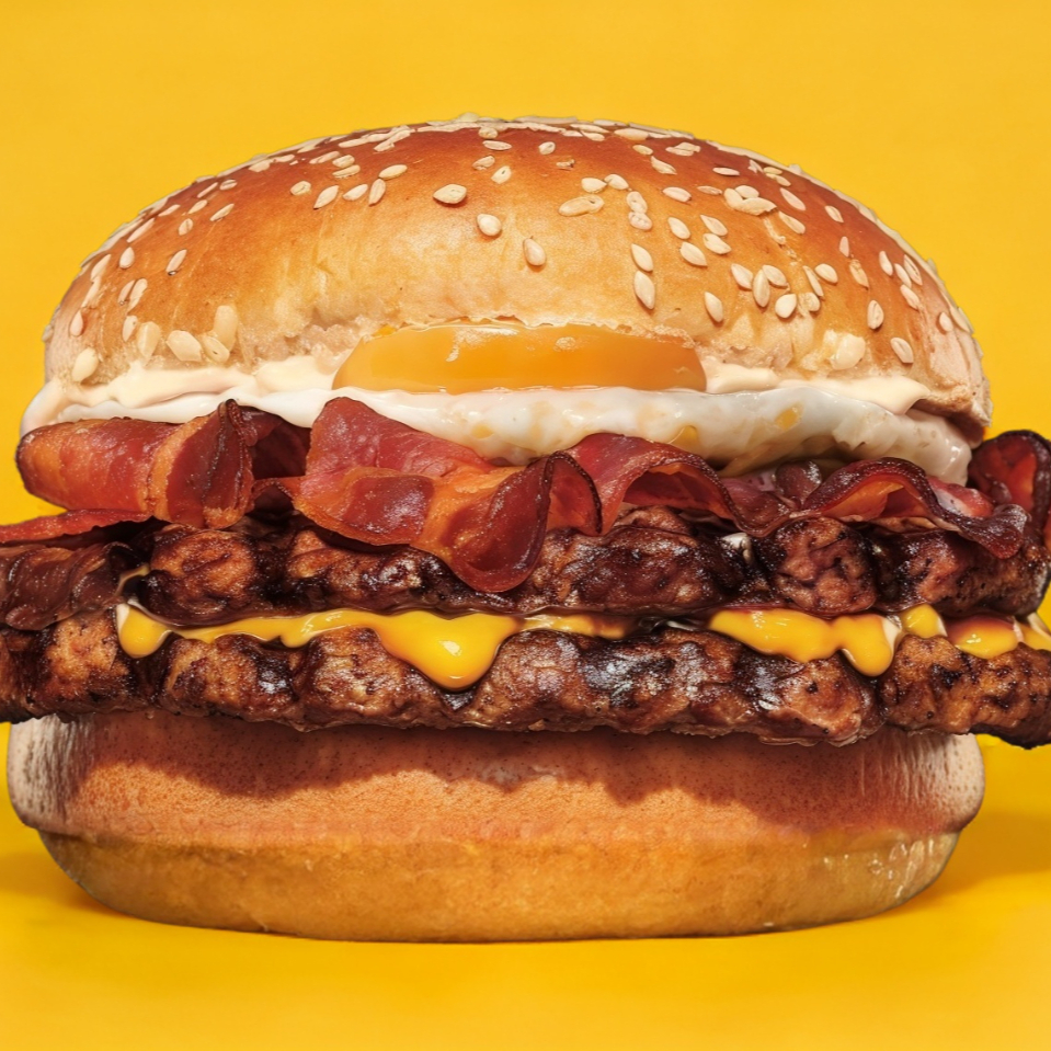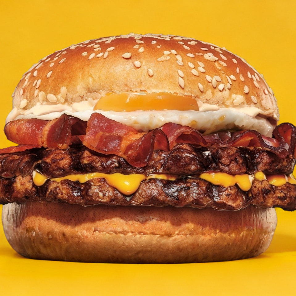 Hamburgues Bacón acompañada de 1 porción de jugosa carne, jitomate, lechuga, cebolla, chile en vinagre, queso Oaxaca, jamón, queso amarillo, tocino y aderezos.