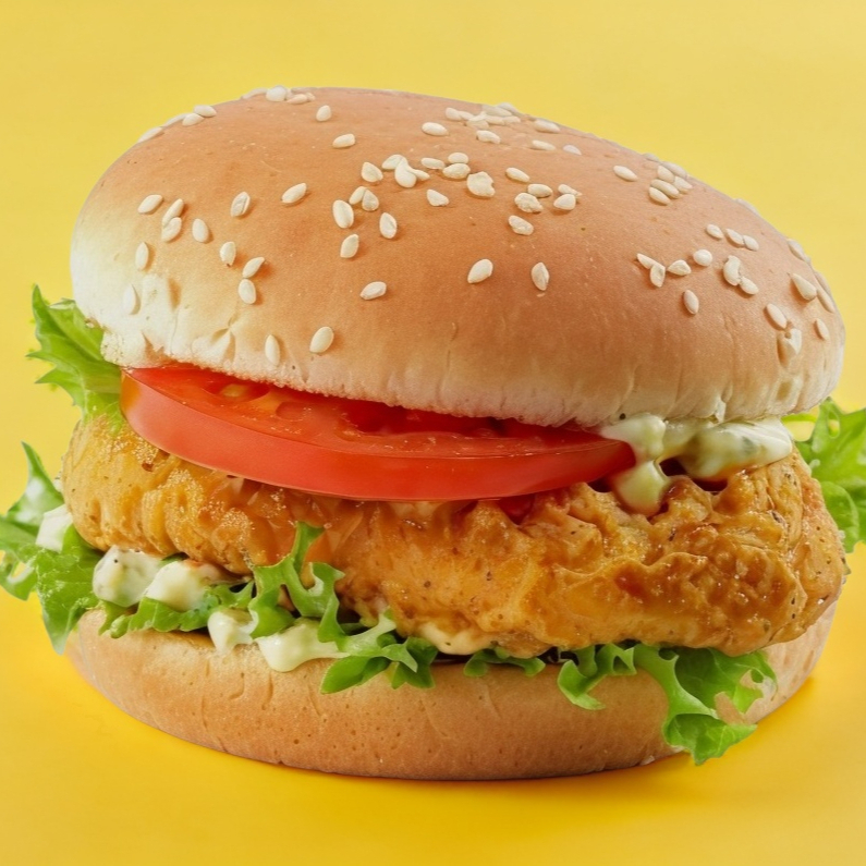 Hamburguesa de pollo acompañada lechuga, jitomate, cebolla, chiles en vinagre, queso amarillo y aderezos