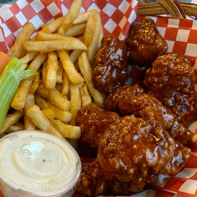 Disfruta De lo Irresistible. A tu Paladar 6 Alitas sabor Buffalo, Bañadas de Su Salsa Base y Acompañas de Media orden de Papas a la Francesa, Una Cama de lechuga Fresca, Tenedor ,Sal y Limon GRATIS incluye. LO DE HOY ES BOTANEATE TU DÍA con Unas alitas Y Agrégale Salsa extra a tu Vida.