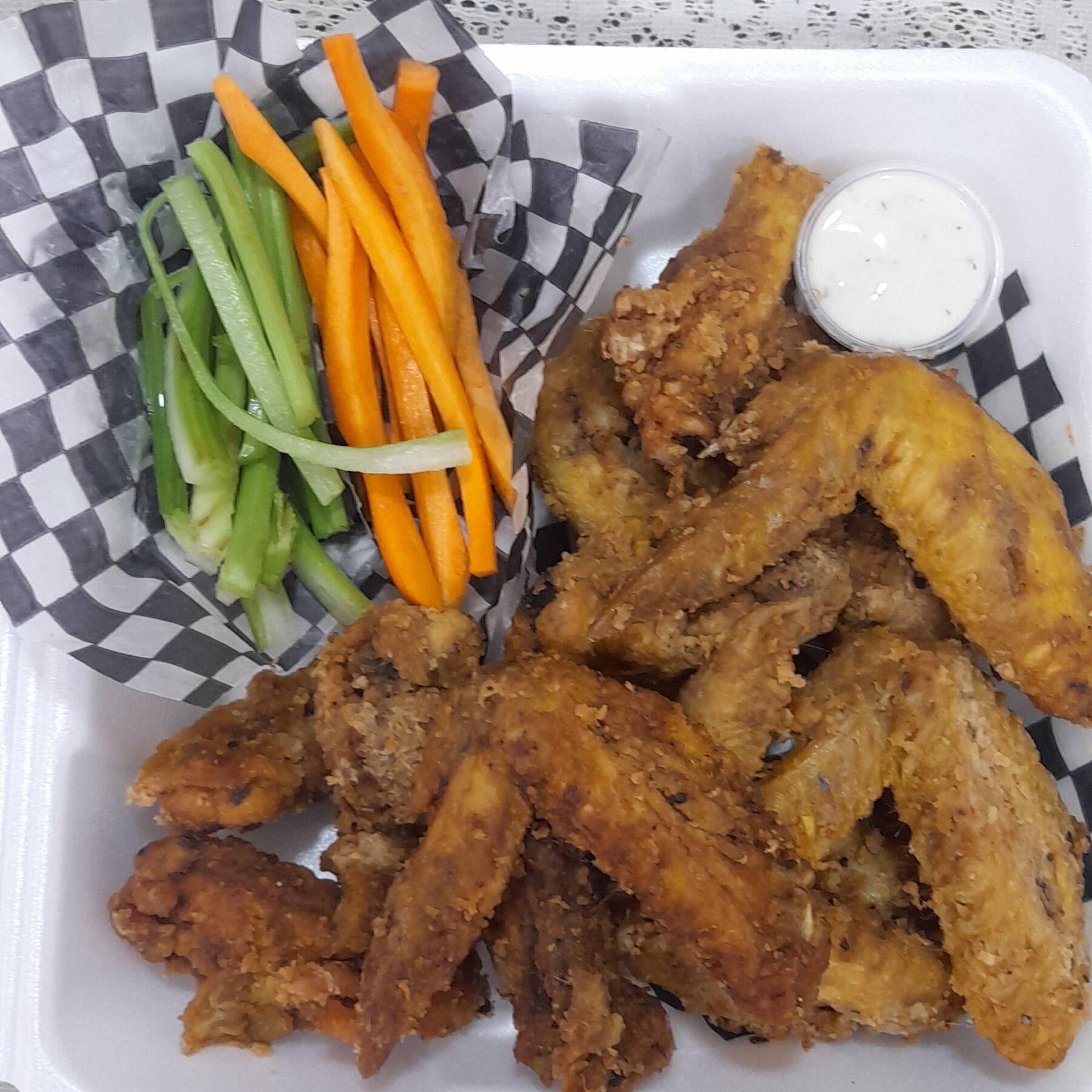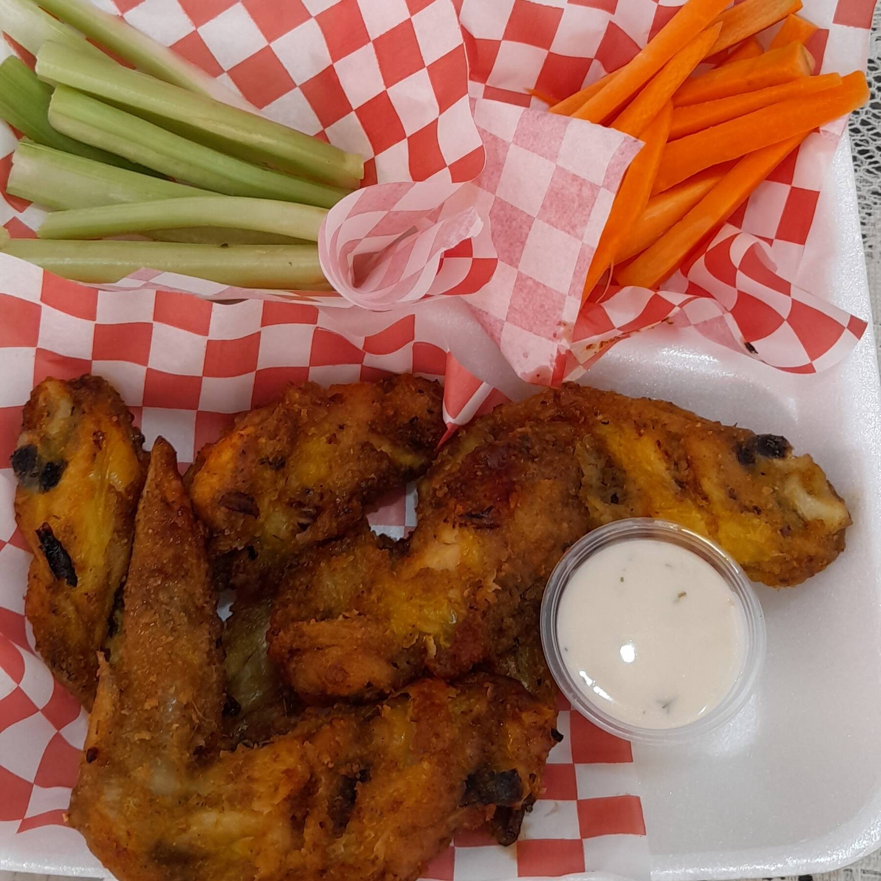 alitas naturales al carbón con un sabor a elegir, BBQ, Tamarindo a los 3 chiles, Mango habanero, Fresa tajin, incluye guarnición de bastones de zanahorias y pepino con dip sabor ranch