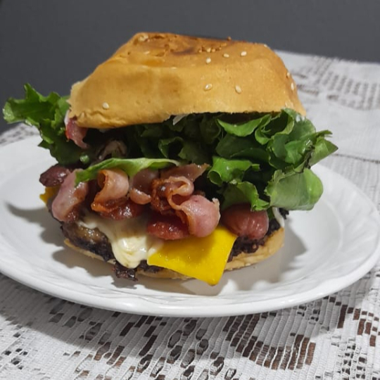 Doble carne de 200 gramos especialidad de la casa, doble queso oaxaca, doble queso amarillo, jitomate, cebolla, rajas, lechuga, capsu, mostaza