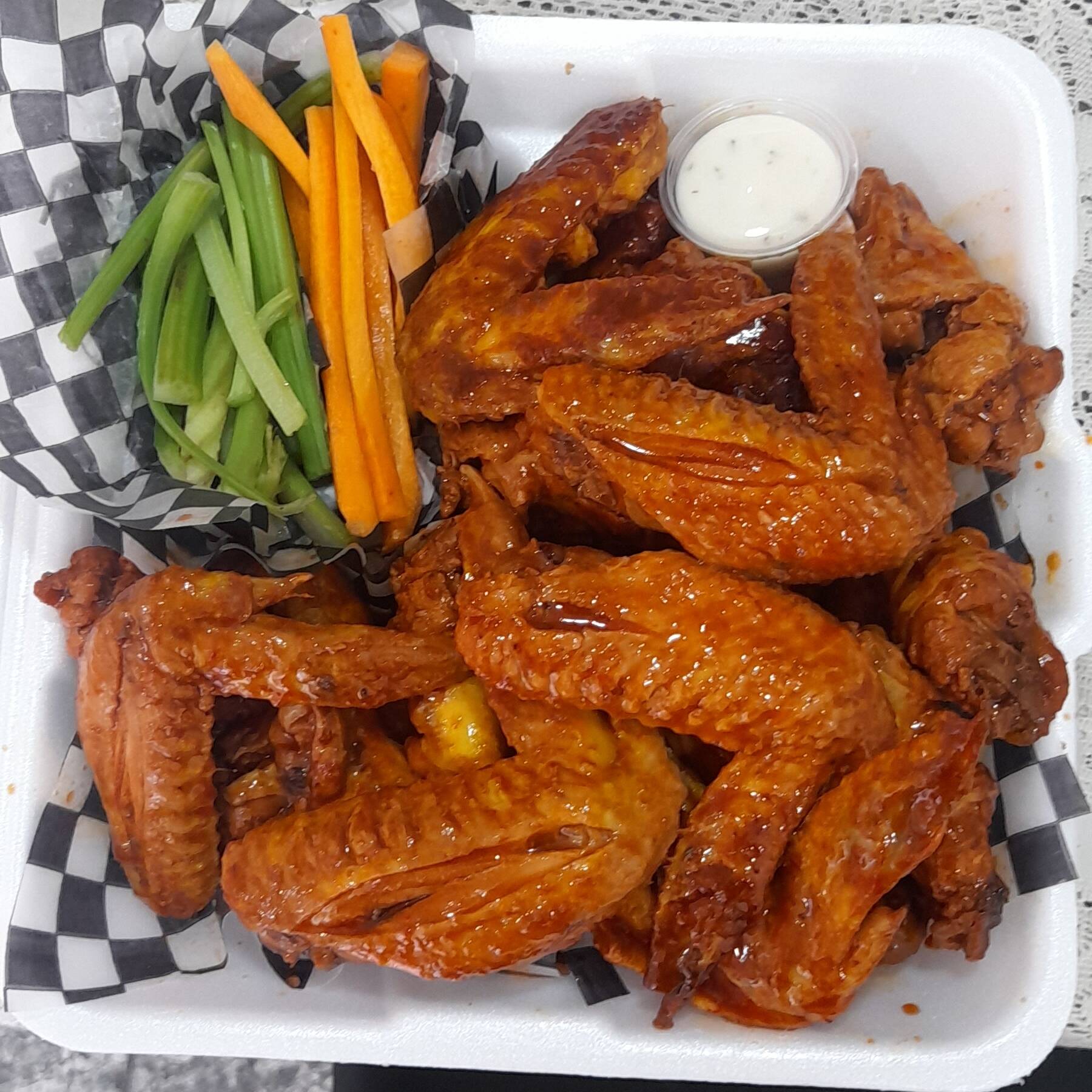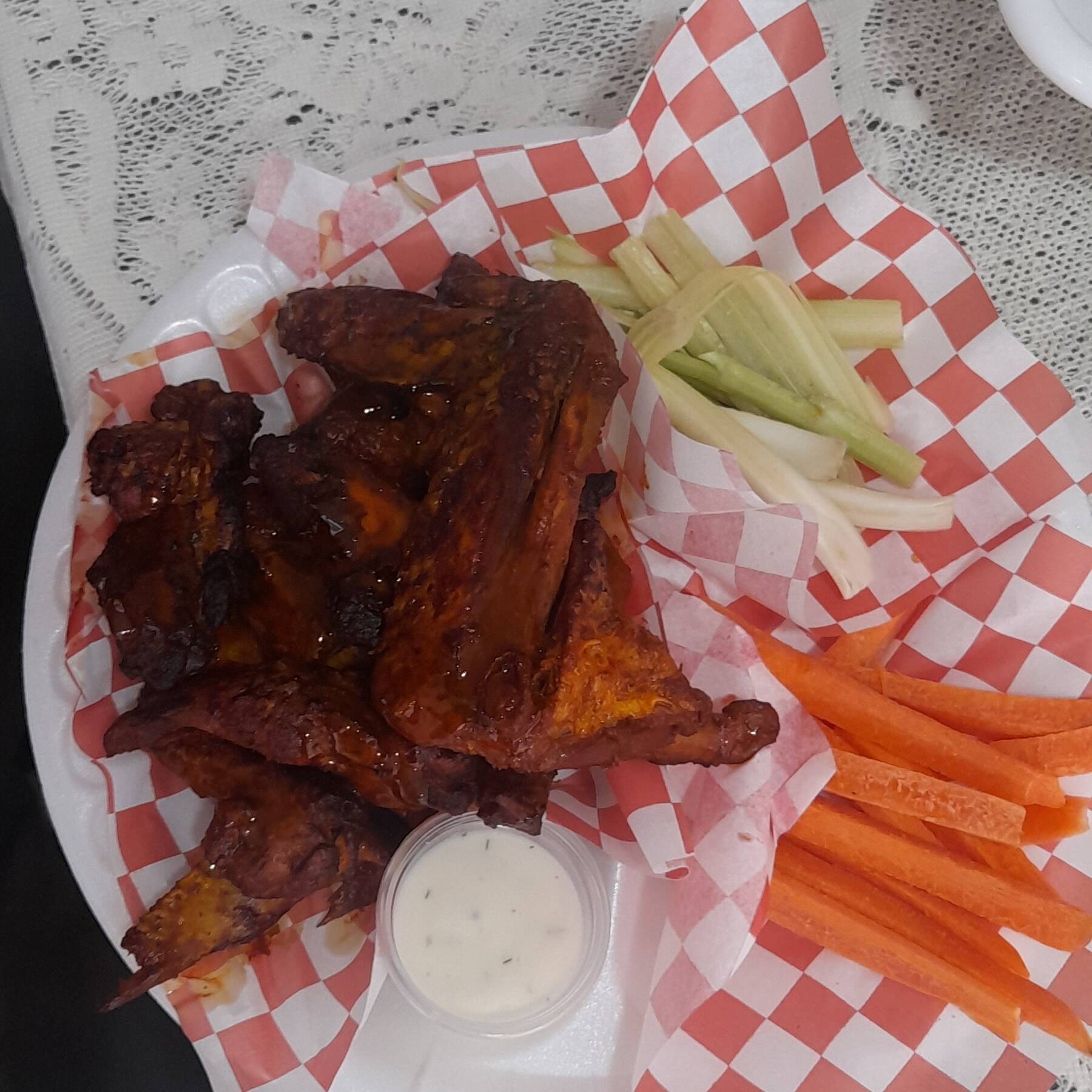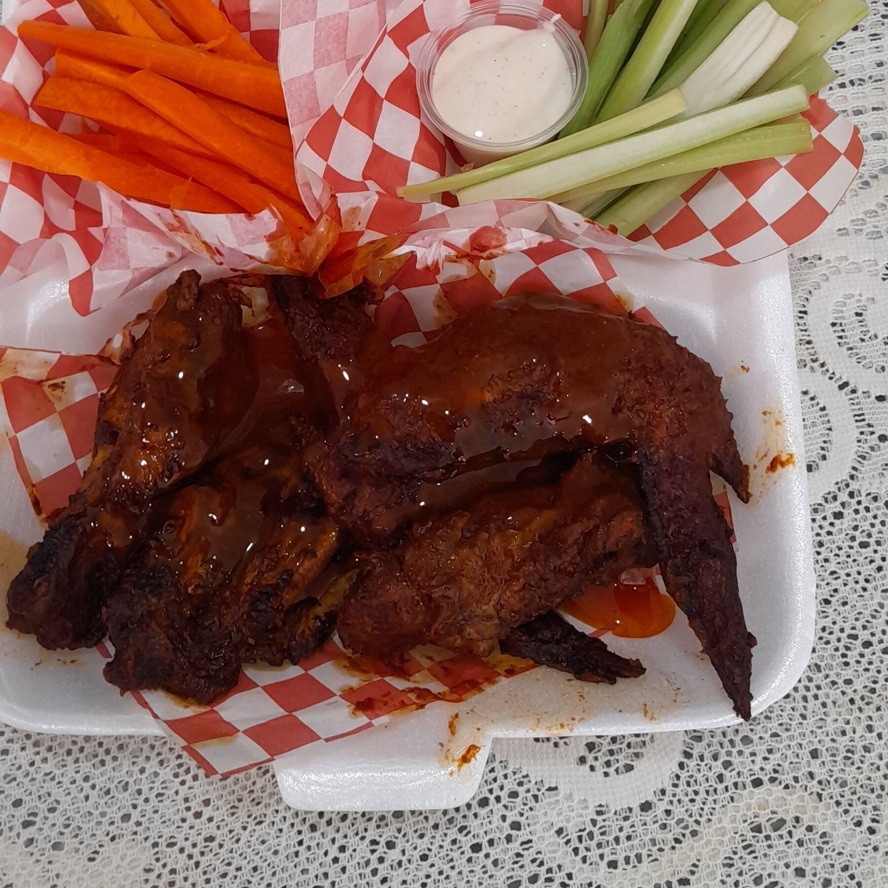 alitas adobabas al carbón con un sabor a elegir, BBQ, Tamarindo a los 3 chiles, Mango habanero, Fresa tajin, incluye guarnición de bastones de zanahorias y pepino con dip sabor ranch