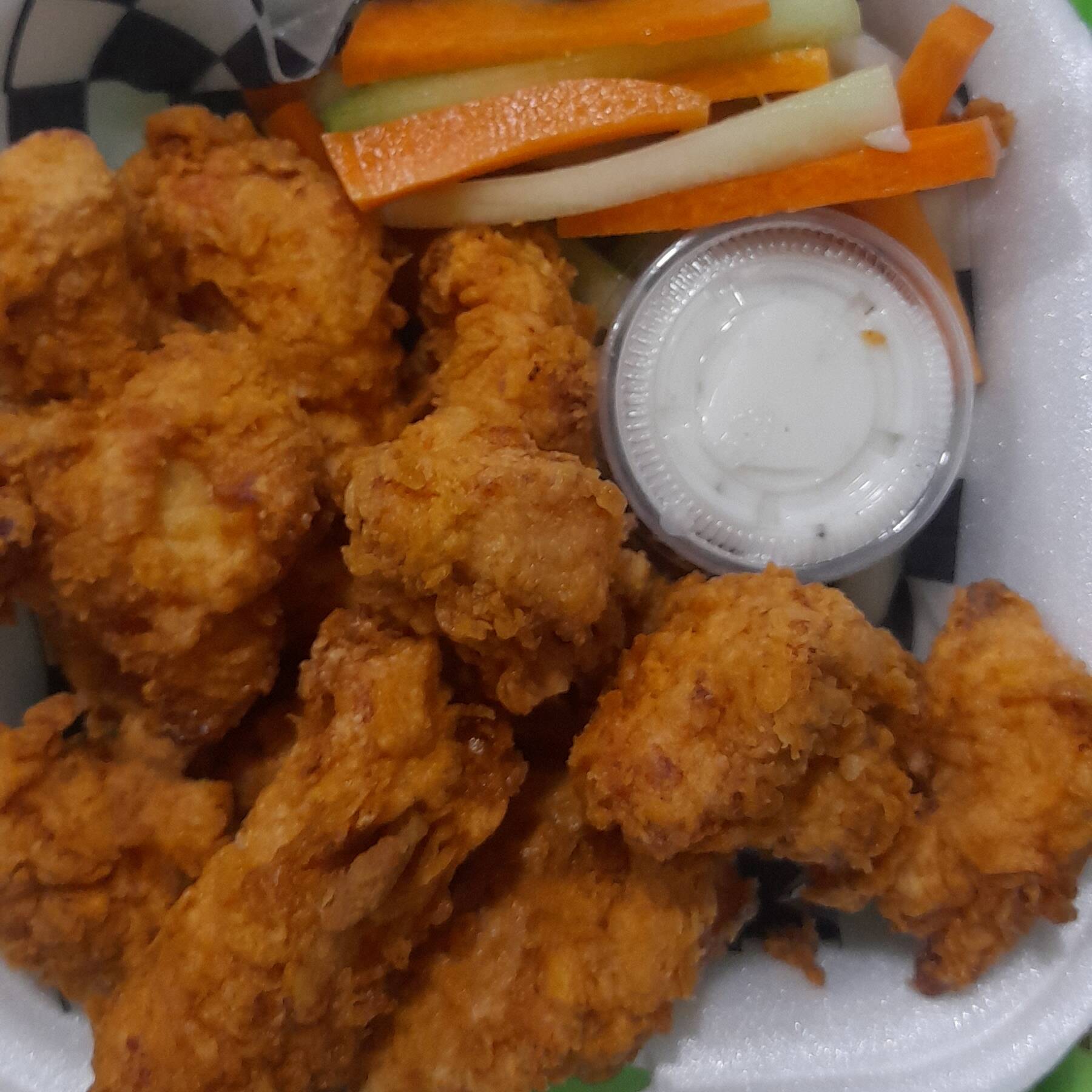150 Gramos de boneless, con un sabor a elegir, bbq, tamarindo a los 3 chiles, mango habanero, fresa tajin, incluye guarnición de bastones de zanahorias y pepino con dip sabor ranch