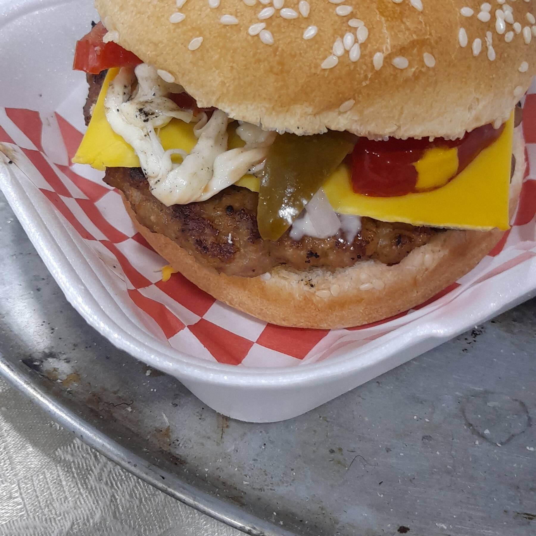 carne de cerdo 200 grs, queso amarillo, queso oaxaca, jitomate, cebolla y picante