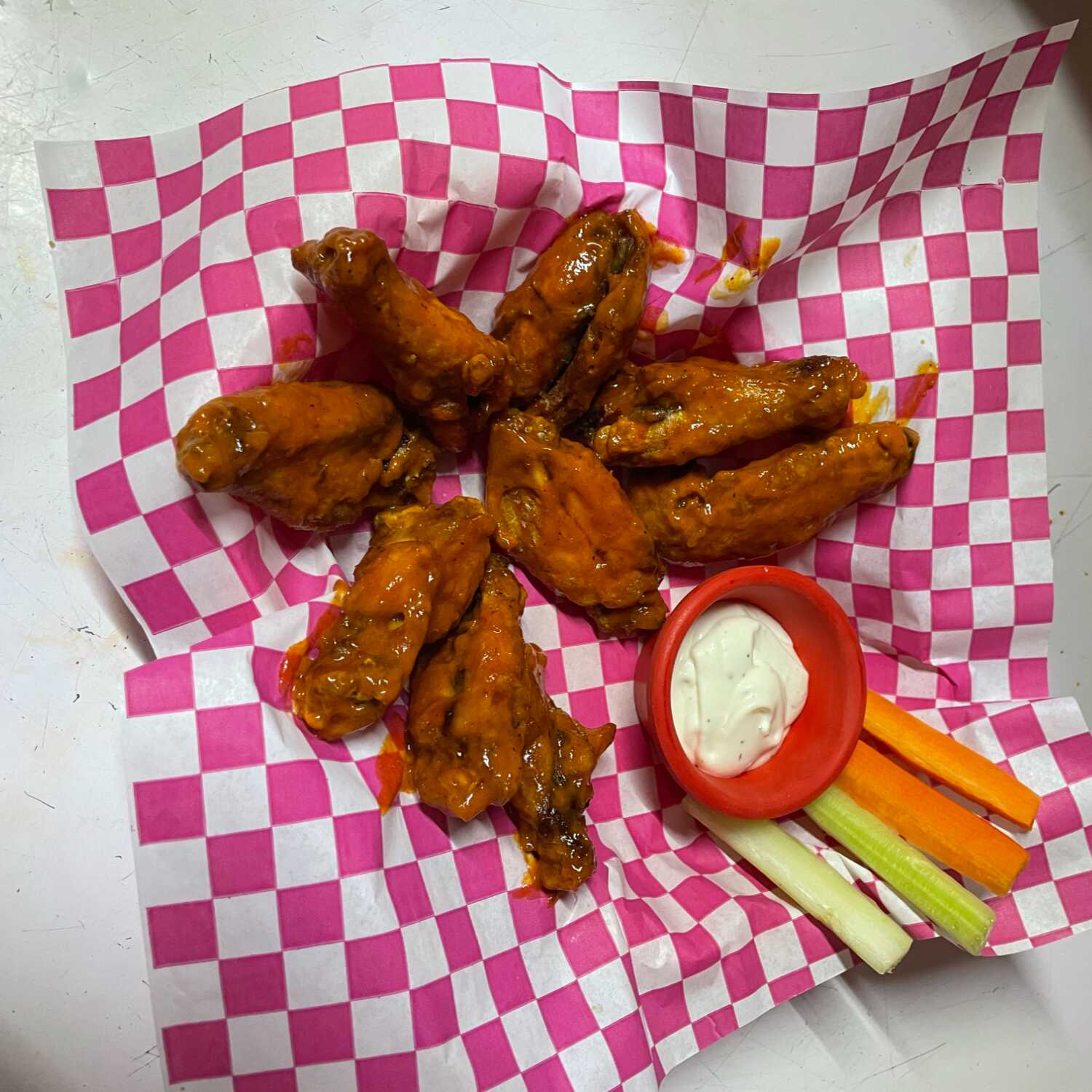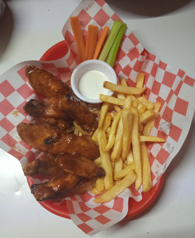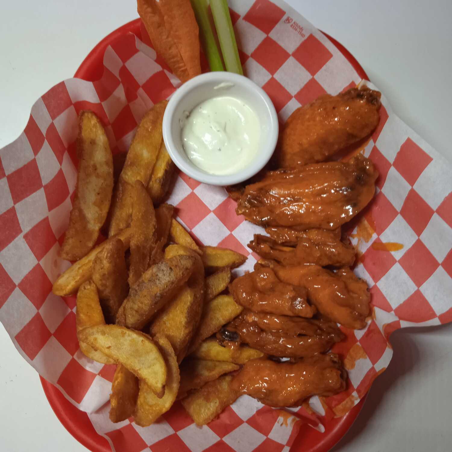 10 Alitas bañadas en la salsa de tu preferencia y 230 gramos de papas, acompañadas com aderezo ranch y bastones de apio y zanahoria..