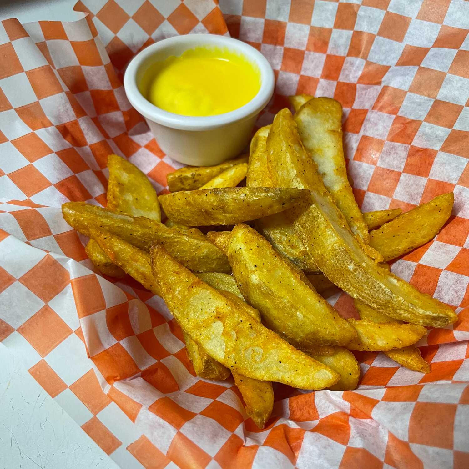 250 Gramos de papas gajo, acompañadas con queso amarillo liquido