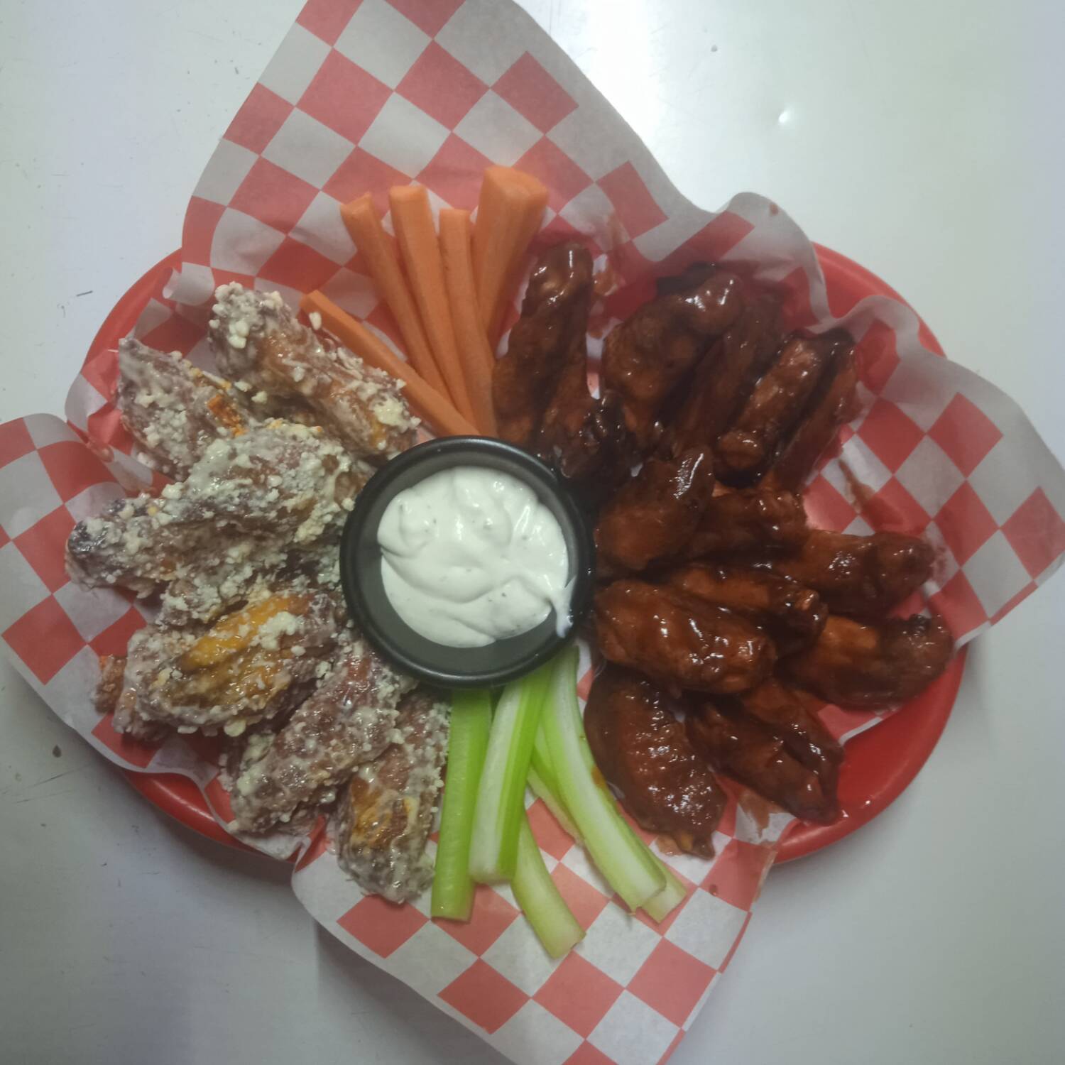 25 ALITAS BAÑADAS EN LA SALSA DE TU PREFERENCIA, ACOMPAÑADAS CON ADEREZO RANCH Y BASTONES DE APIO Y ZANAHORIA