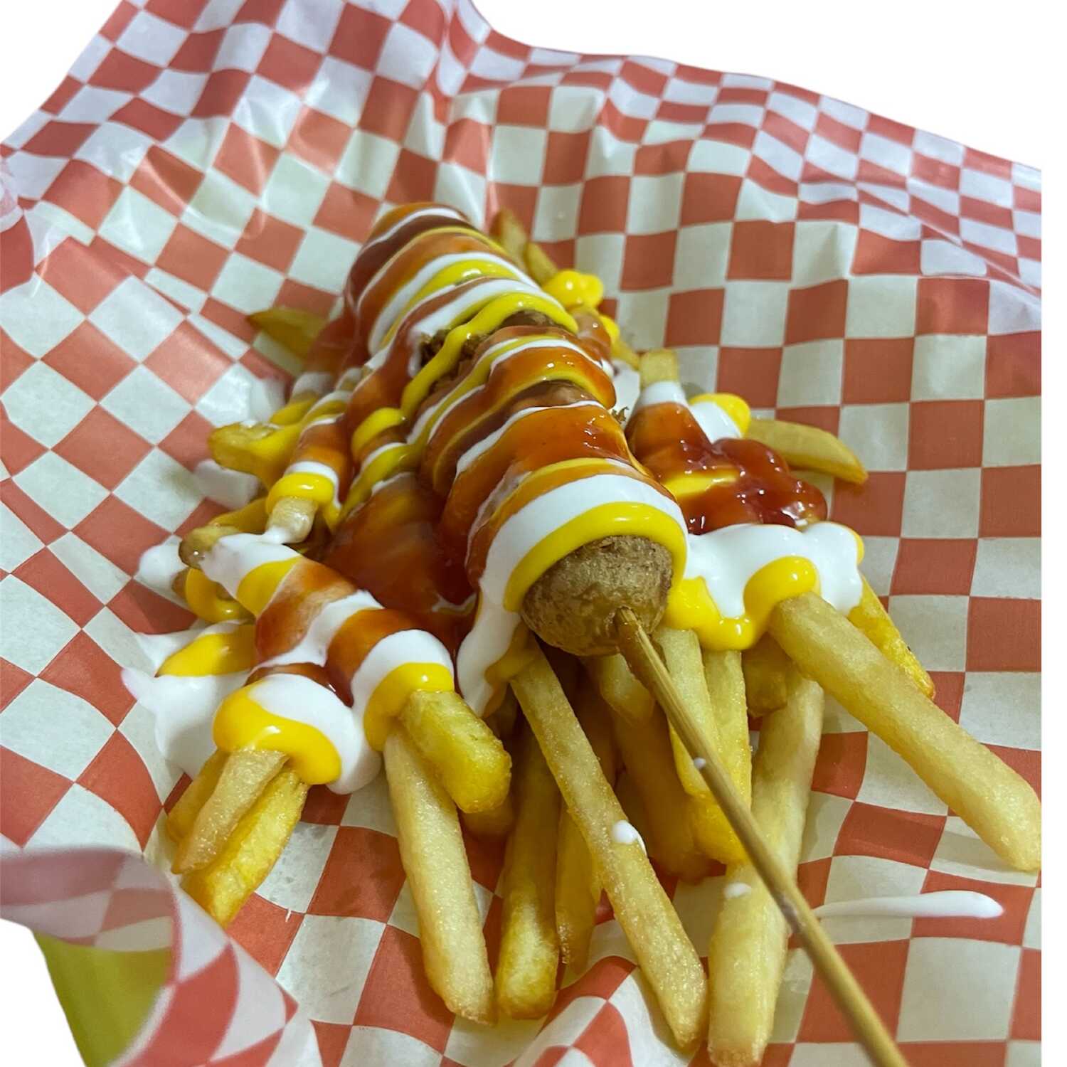 Salchicha chica, jitomate, cebolla, chiles en vinagre, mayonesa, cátsup y mostaza acompañado con 130 gramos de papas.