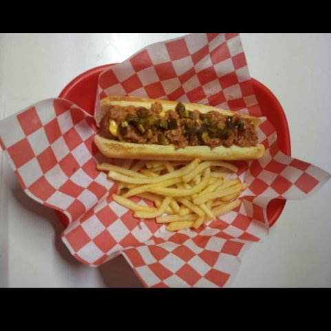 Salchicha de 100 gramos, queso amarillo fundido, chilli y chiles en vinagre. acompañado con 130 gramos de papas