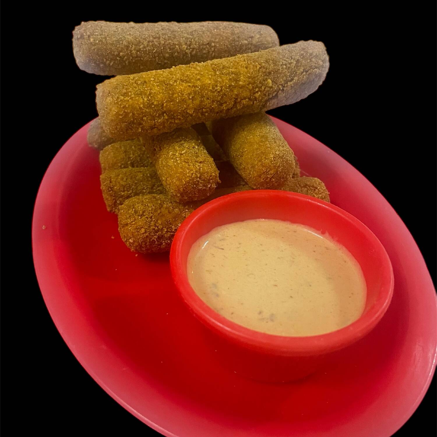 8 dedos de queso mozarella, acompañados con aderezo de chipotle