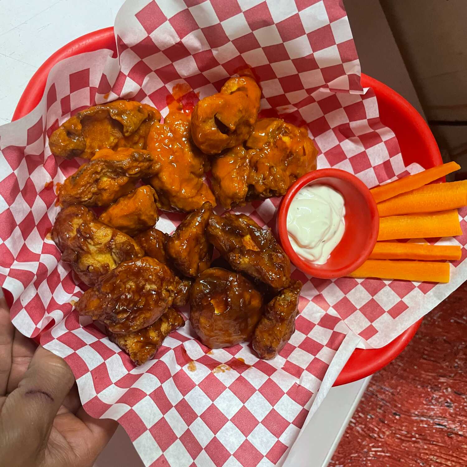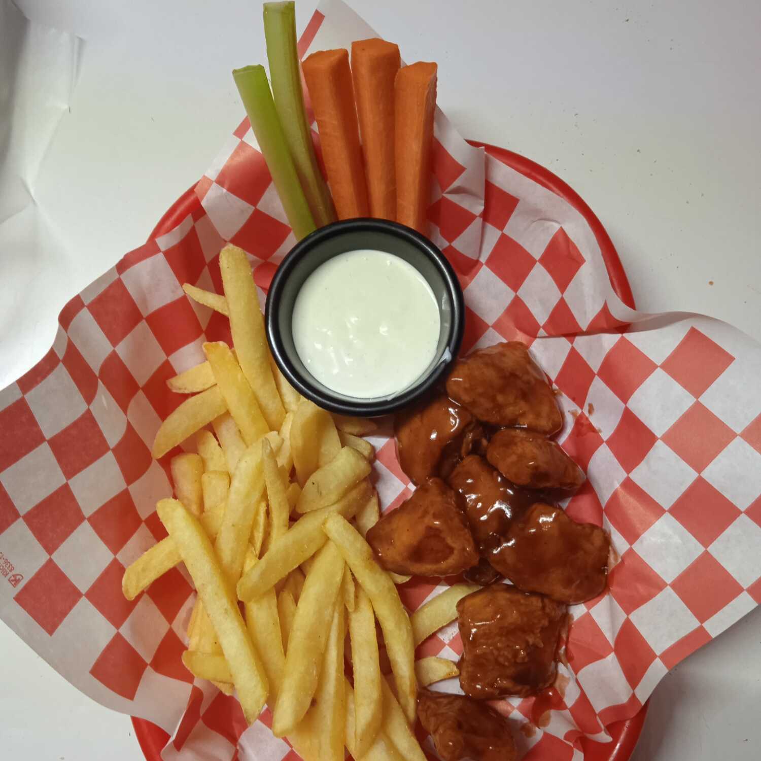 10 BONELESS BAÑADOS EN LA SALSA DE TU PREFERENCIA, ACOMPAÑADOS CON ADEREZO RANCH Y BASTONES DE APIO Y ZANAHORIA