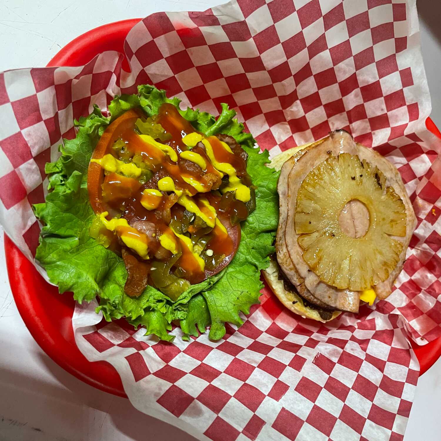 100 Gramos de carne de res, queso oaxaca, queso amarillo, jamón, lechuga, jitomate, chiles en vinagre, pepinillos, tocino, cátsup, piña, mostaza y mayonesa.