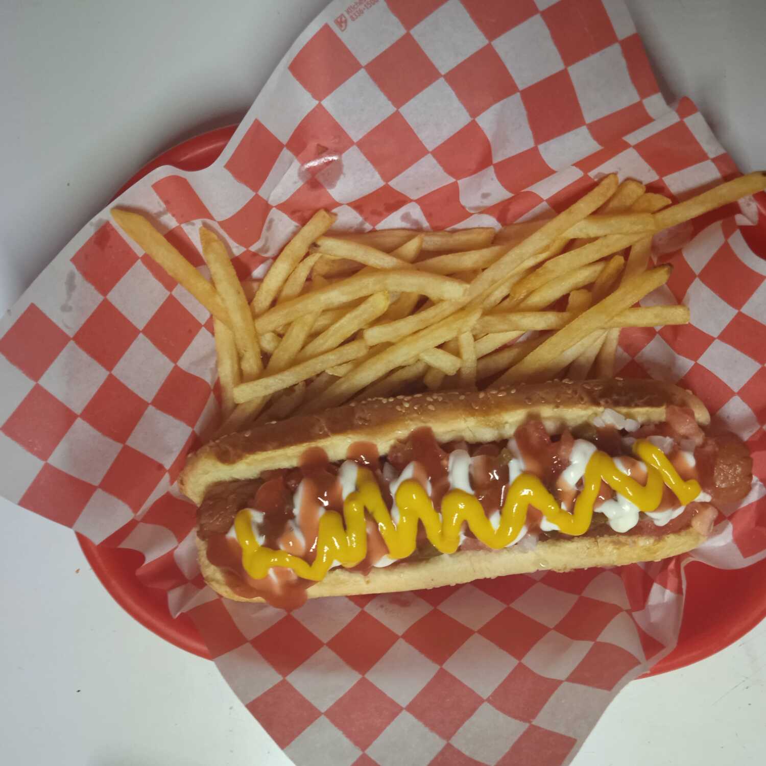 Salchicha de 100 gramos, jitomate, cebolla, chiles en vinagre, tocino, mayonesa, cátsup y mostaza acompañado con 130 gramos de papas.