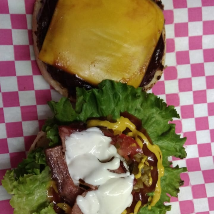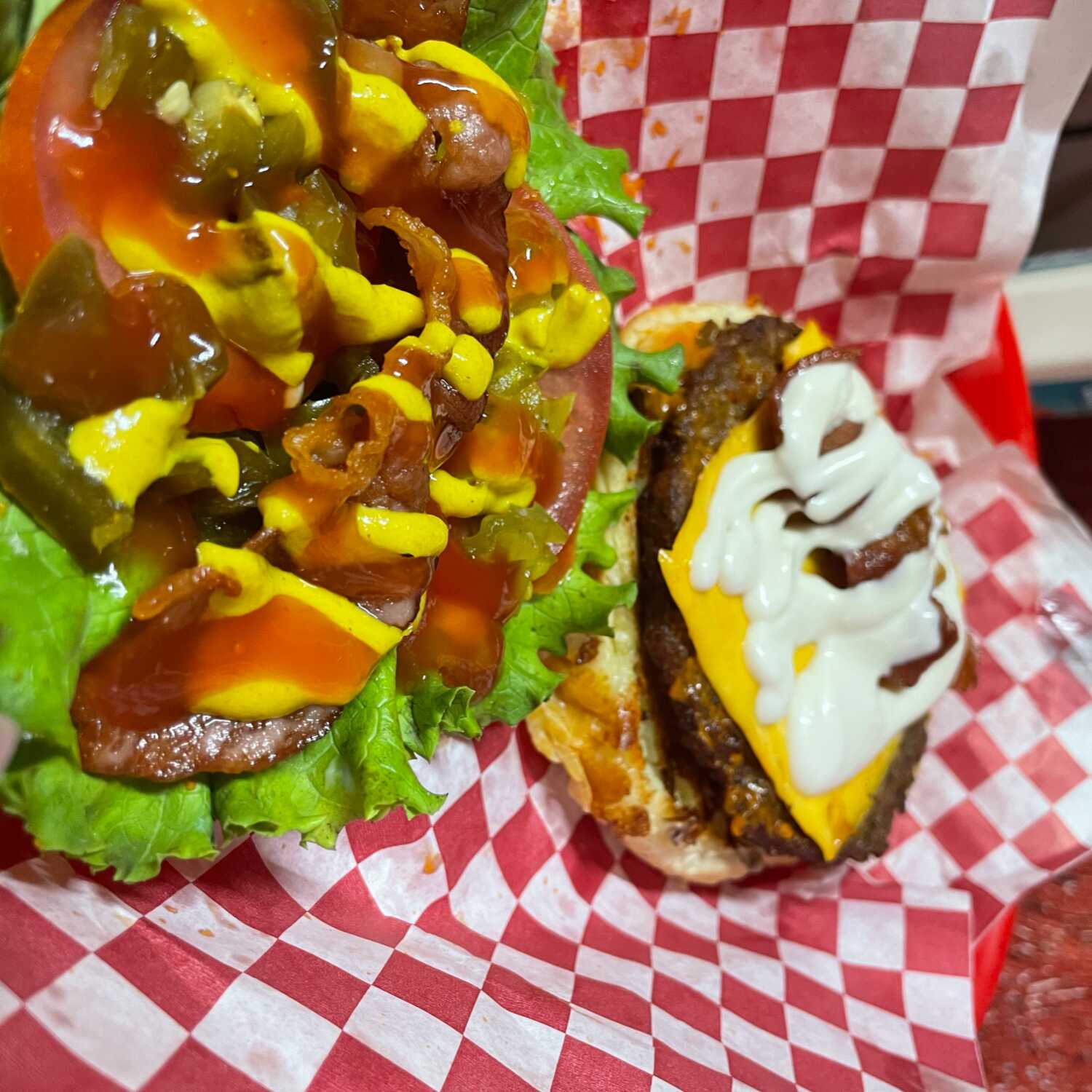 140 Gramos de carne de res marinada con bbq, costra de queso, queso amarillo, lechuga, jitomate, chiles en vinagre, pepinillos, tocino, cátsup, mostaza y blue cheese.