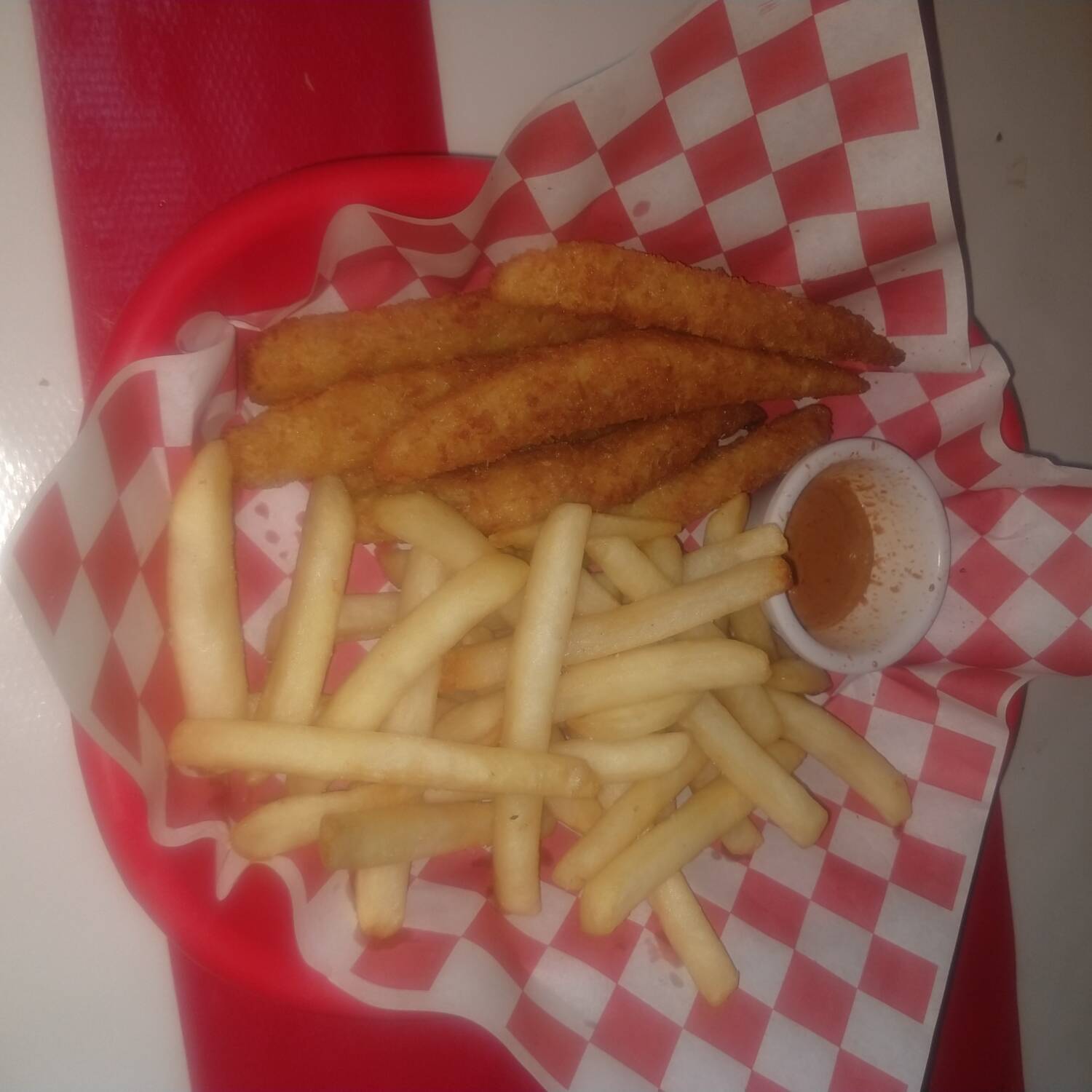 150 Gramos de tiras de pechuga de pollo empanizadas y 130 gramos de papas, acompañados con salsa tamarindo-chipotle y catsup