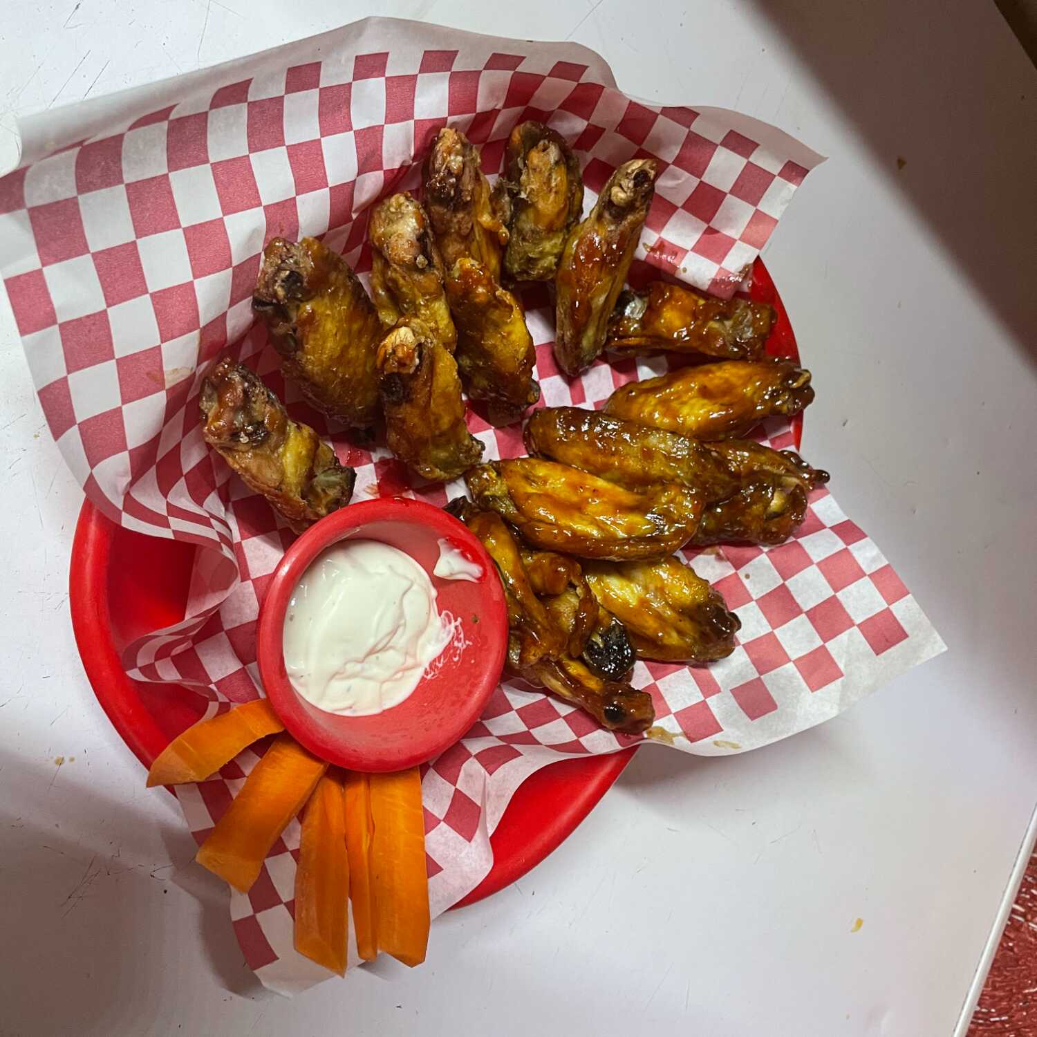 15 ALITAS BAÑADAS EN LA SALSA DE TU PREFERENCIA, ACOMPAÑADAS CON ADEREZO RANCH Y BASTONES DE APIO Y ZANAHORIA