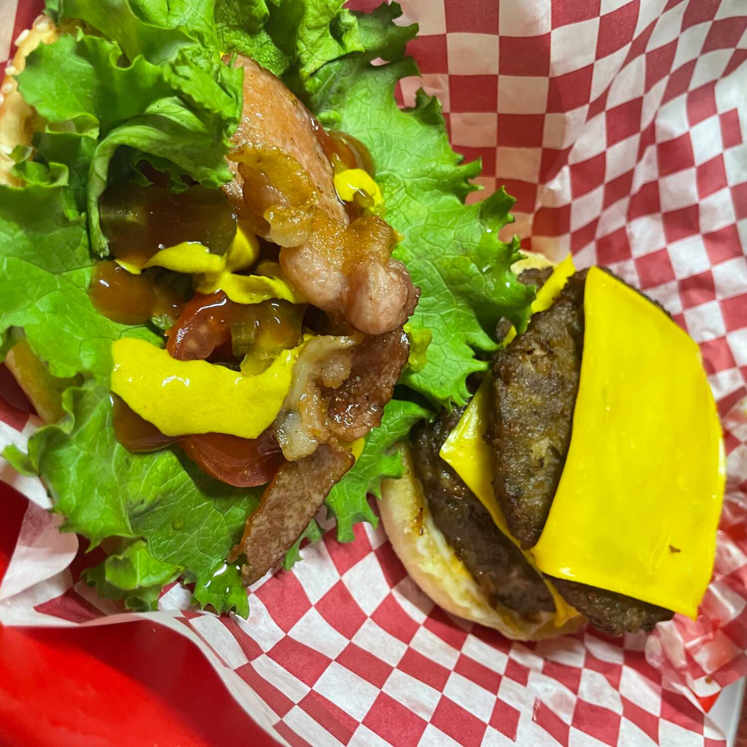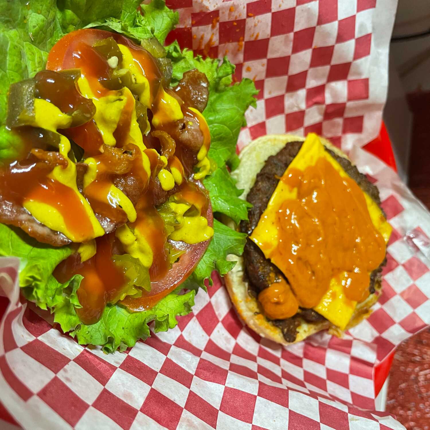 140 Gramos de carne de res marinada con salsa búfalo, costra de queso, queso amarillo, lechuga, jitomate, chiles en vinagre, pepinillos, tocino, cátsup, mostaza y blue cheese.