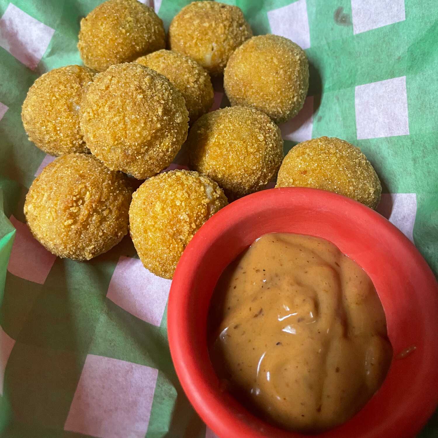 10 Bolitas de papa empanizadas, rellenas con queso gouda, jamón y jalapeño. acompañadas con aderezo de chipotle