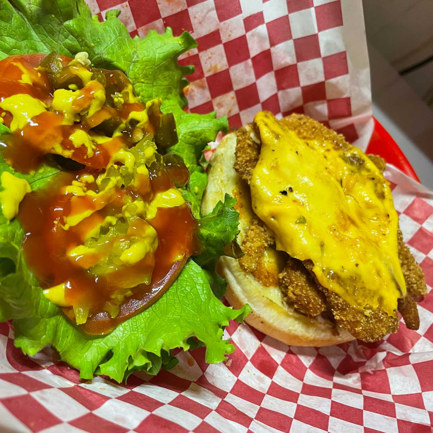 100 GRAMOS DE TIRAS DE POLLO EMPANIZADAS, COSTRA DE QUESO, QUESO AMARILLO, LECHUGA, JITOMATE, CHILES EN VINAGRE, PEPINILLOS, CATSUP, MOSTAZA Y NAYONESA