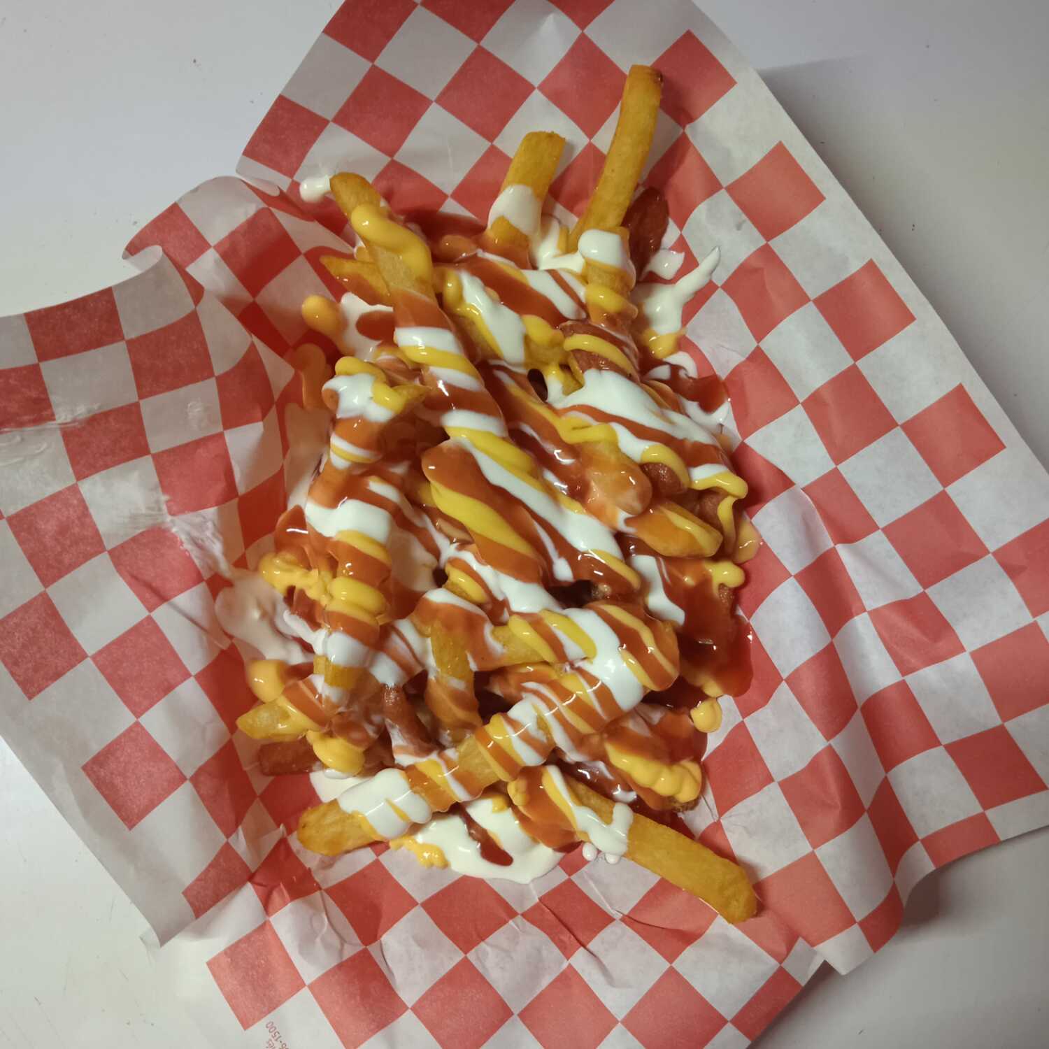 200 Gramos de salchicha con queso, crema, cátsup y salsa; con 130 gramos de papas a la francesa